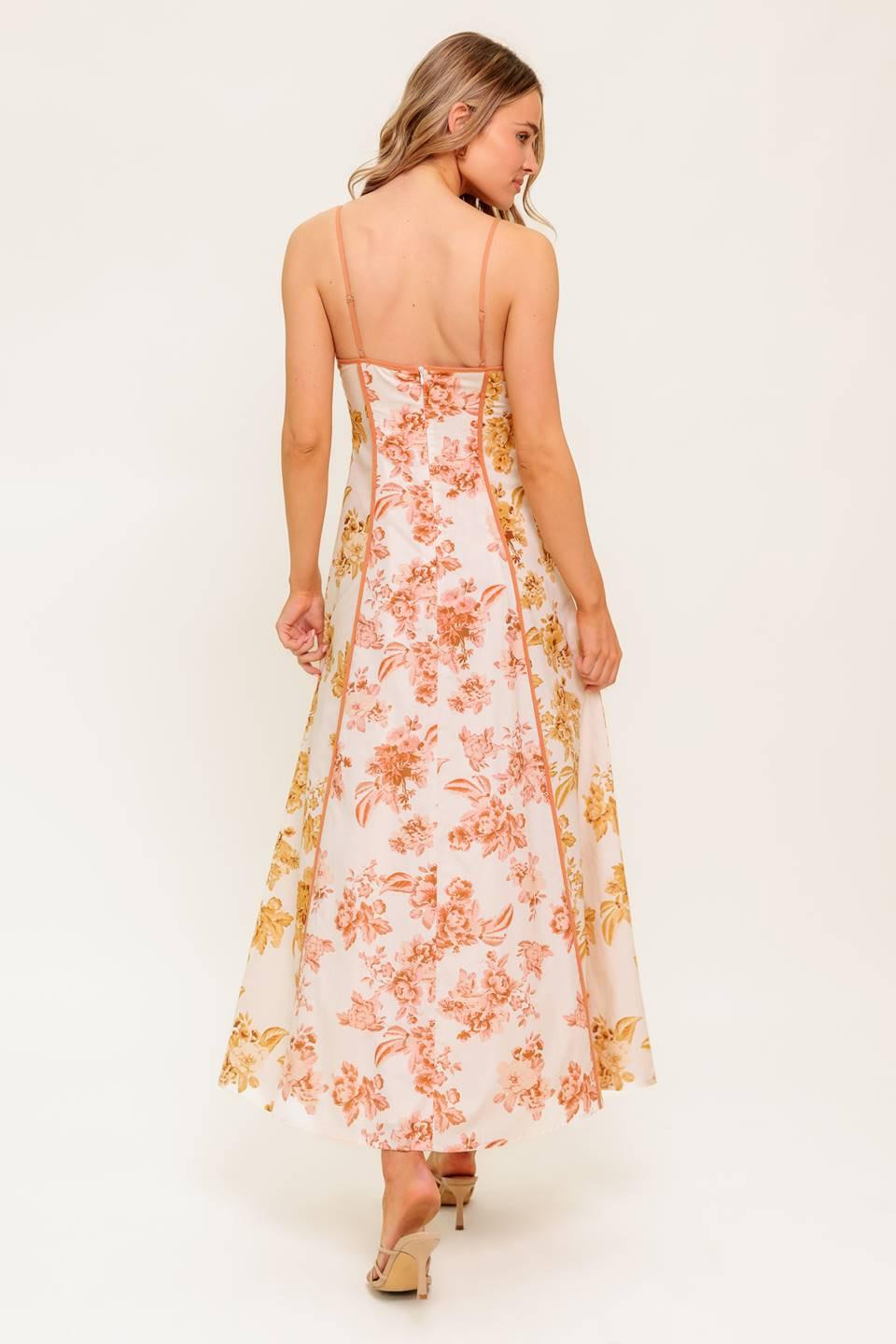 A floral printed woven midi dress featuring cami top, circle skirt and back zipper closure.