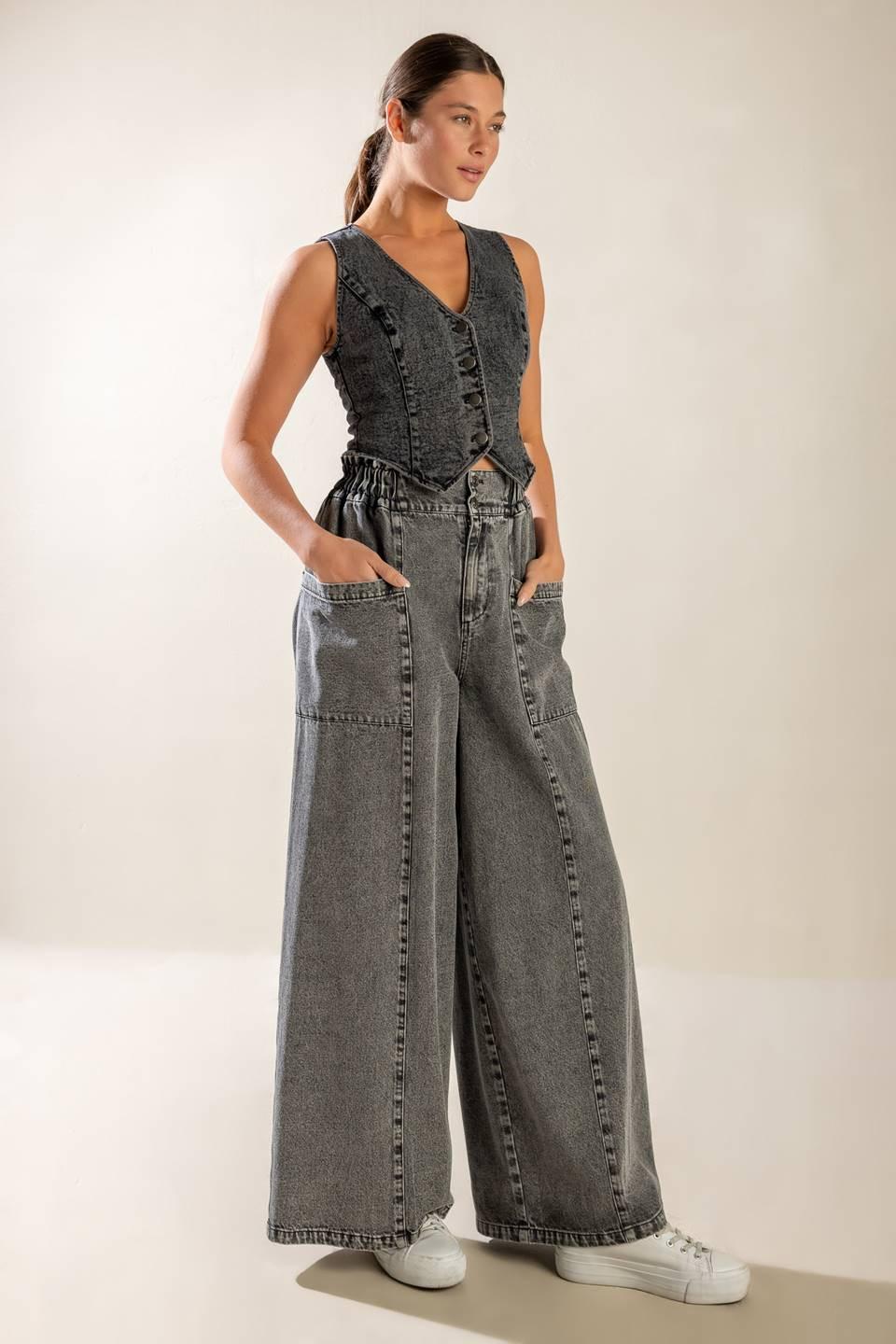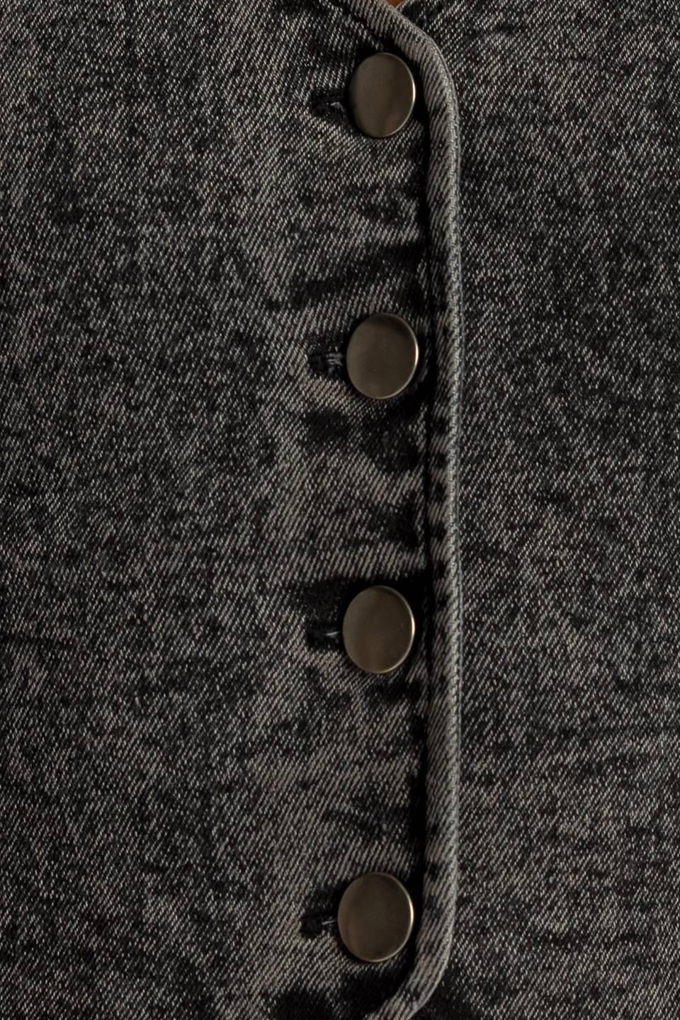 A washed denim vest with front closure