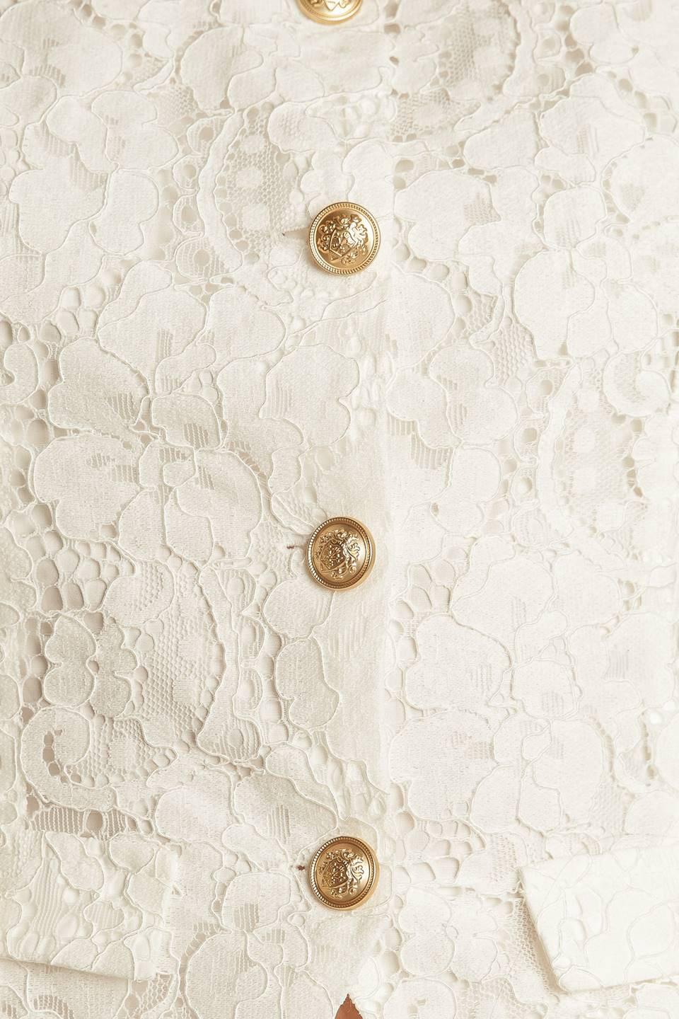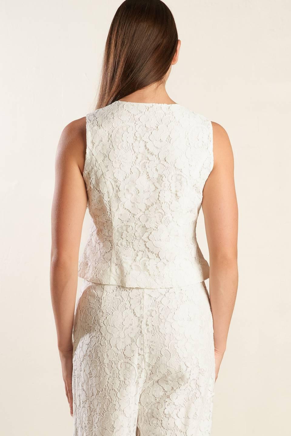 A white sleeveless woven lace vest featuring round neckline and button down.