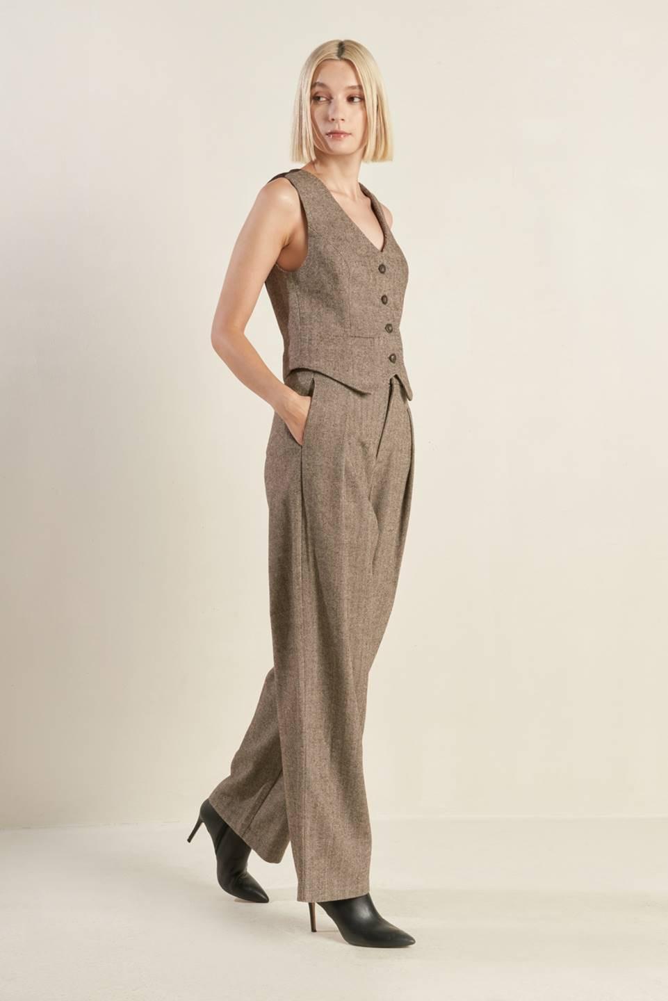 A woolen pant featuring front pleat, side pocket, front closure and wide leg. Matching vest VIBRANT DAZE WOVEN VEST
