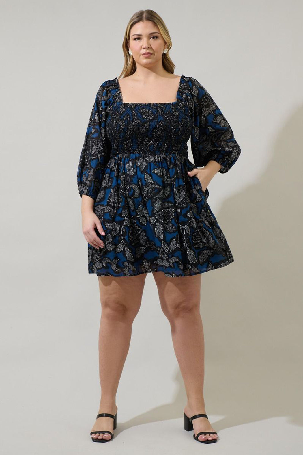 This fit and flare mini dress in black, navy and white abstract floral print features 3/4 puff sleeves, a square neckline, smocked bodice, and pockets! Pair with tall black boots and tights for a holiday party or keep it casual with sneakers and a black jacket. Follow @lunaboutiquecanton on instagram and DM us with any questions :)