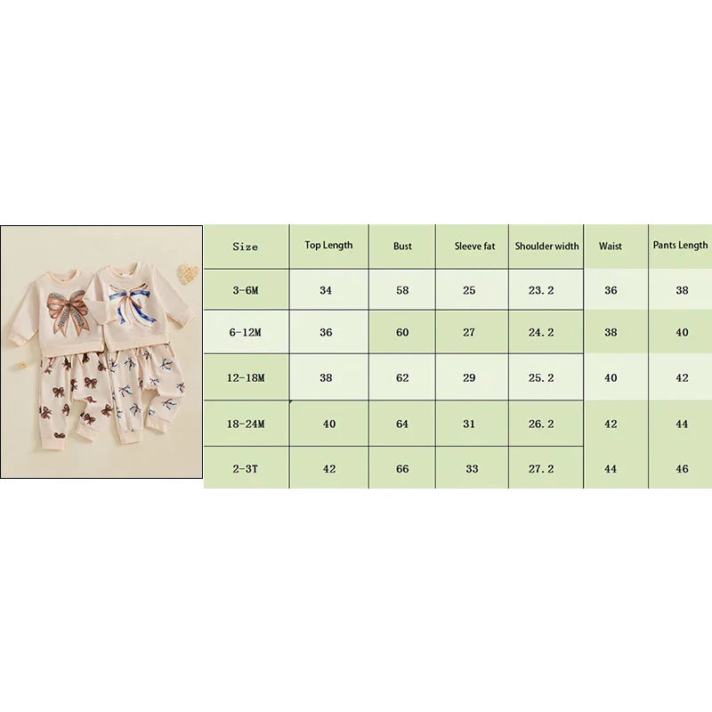 3-6M Tops Length: 13.39 Bust: 22.83 Sleeve: 9.84 Shoulder: 9.13 Pants Length: 14.96 Waist: 14.17 Advised Age: 3-6 Months