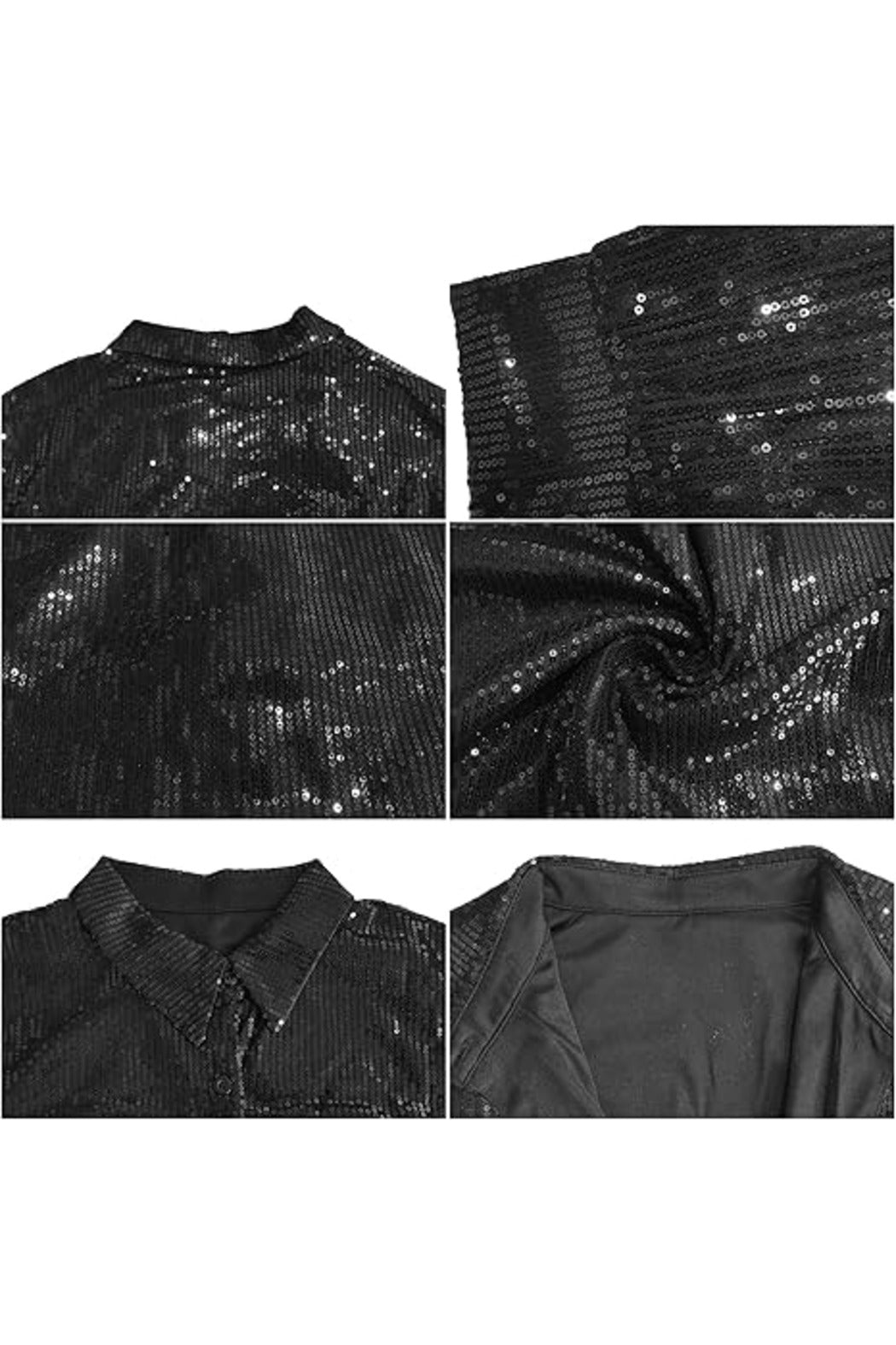 A button down, long sleeved, sequin dress in a flowy tunic style. Midi with high sparkle black sequin. Short collar. Perfect for an amazing night out, or for a stunning party goer. Inner Lining: 95% Polyester 5% Spandex. Care instructions: Wash Seperately, Professional Dry Clean Recommended. Size: XXL.
