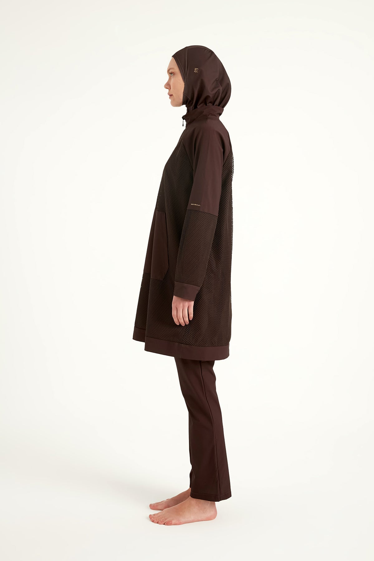 Marina’s M2534-4 brown burkini blends elegance with innovation, featuring tulle overlay details and functional pockets. With a 90 cm tunic and hydrophobic fabric, it caters to both aesthetics and aquatic practicality for women who prefer a contemporary take on modest swimwear.