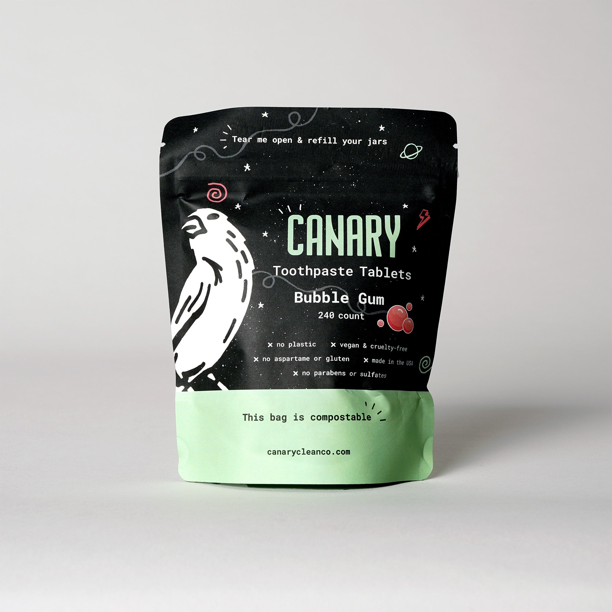 Make brushing fun and eco-friendly with our Plastic-Free Canary Toothpaste Tablets in a kid-approved Bubble Gum Flavor! This refreshing twist on classic pink bubble gum is designed to keep your little ones excited about their oral care routine. The sweet, playful flavor encourages kids to chew, then brush, all while helping to fight cavities and strengthen teeth.
