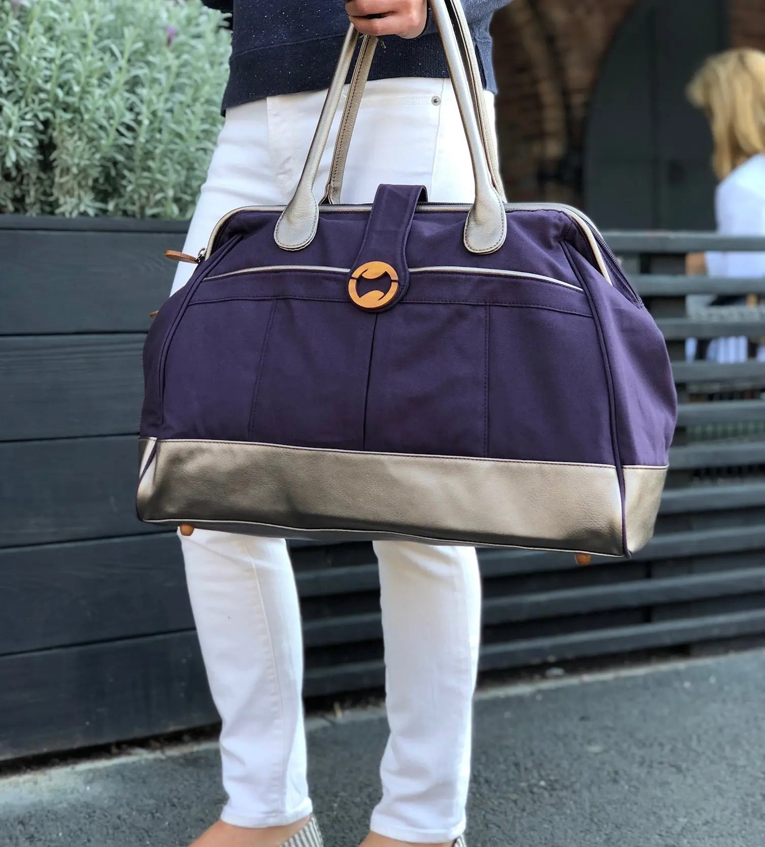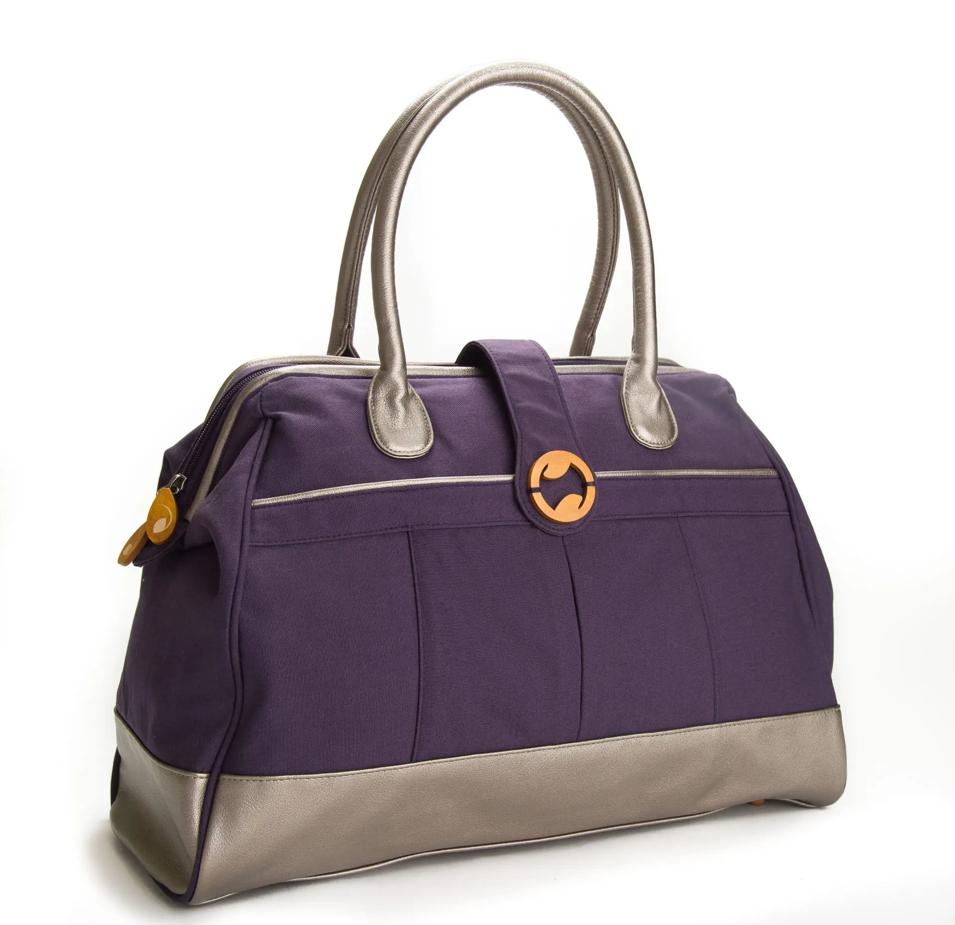The weekender you’ll end up using every day of the week! It’s your understated travel companion to exotic destinations, your sophisticated work bag for laptop and folders, or a sturdy schlepper of all your gym stuff. A vibrant purple organic canvas with gunmetal accents.