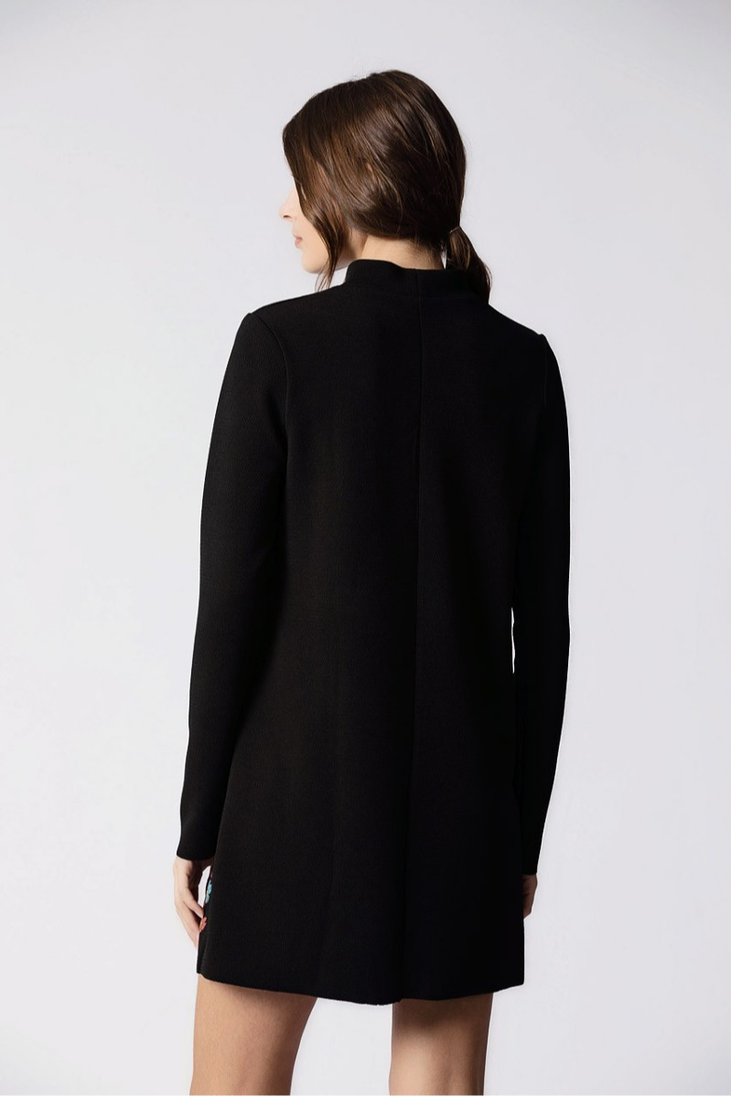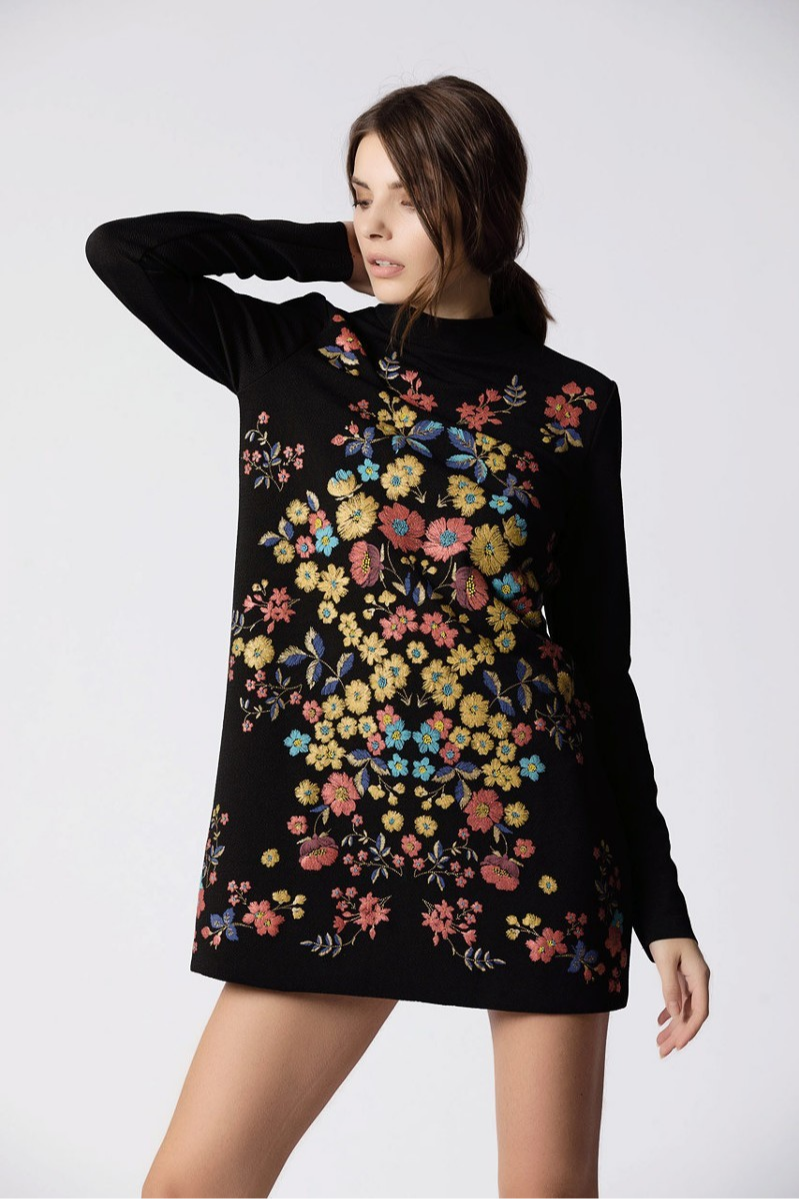 Simple but still elegant is what this dress has to offer this season! This stunning mini dress features beautiful colorful floral details on the front looking like an embroider work with soft shimmer touches to beautify the prints, tall mock neckline, long sleeves, a shift loose bodice, unlined, material has stretch. Hand wash and low iron care instruction. Wear it with ankle high heel booties or add a pair of tights for a warmer style at your Holiday night cocktail event! Model wears size Small L: 33" B: 18"