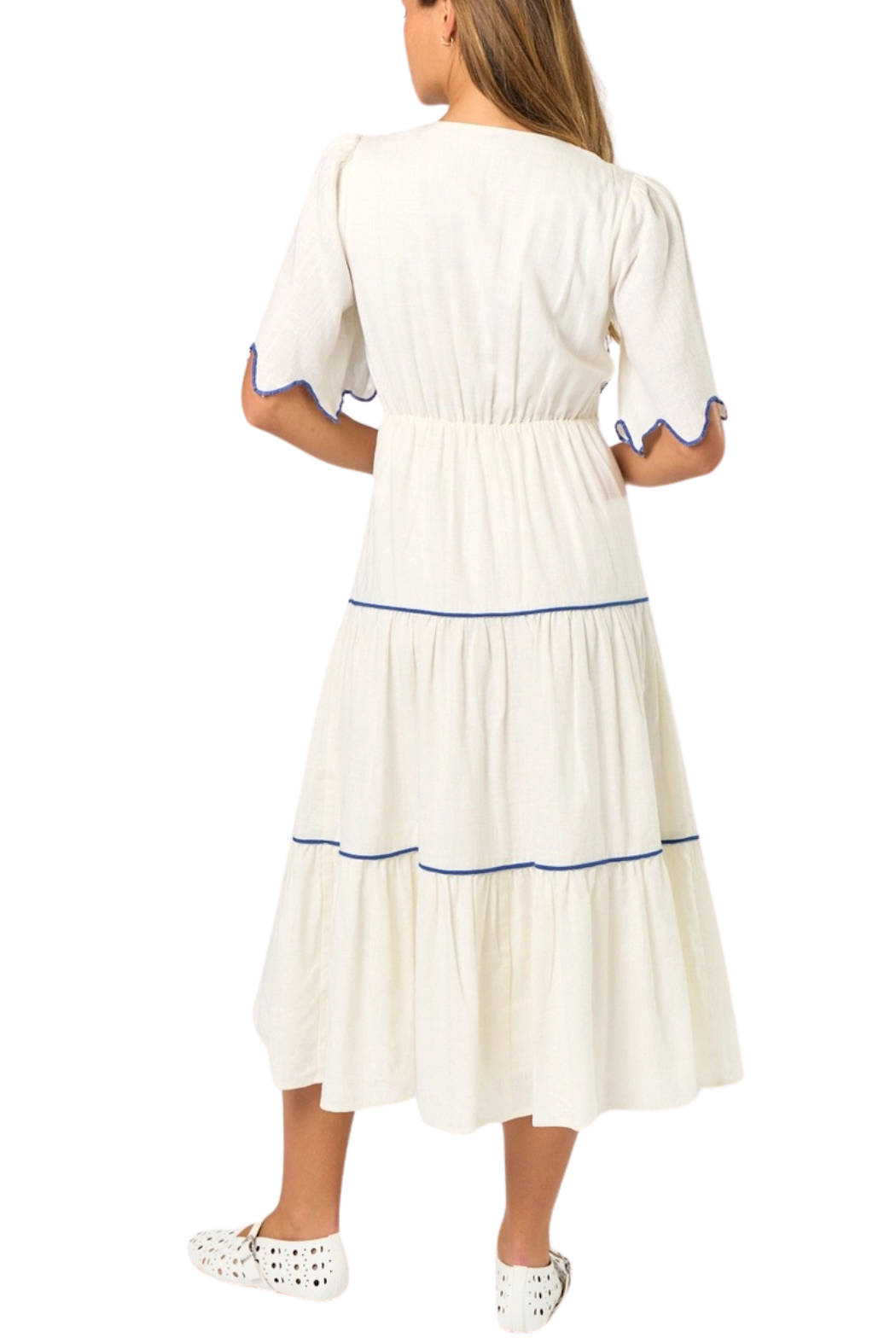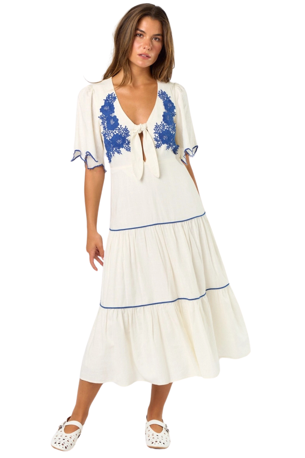 EMBROIDERED SHORT SLEEVE TIERED MIDI DRESS