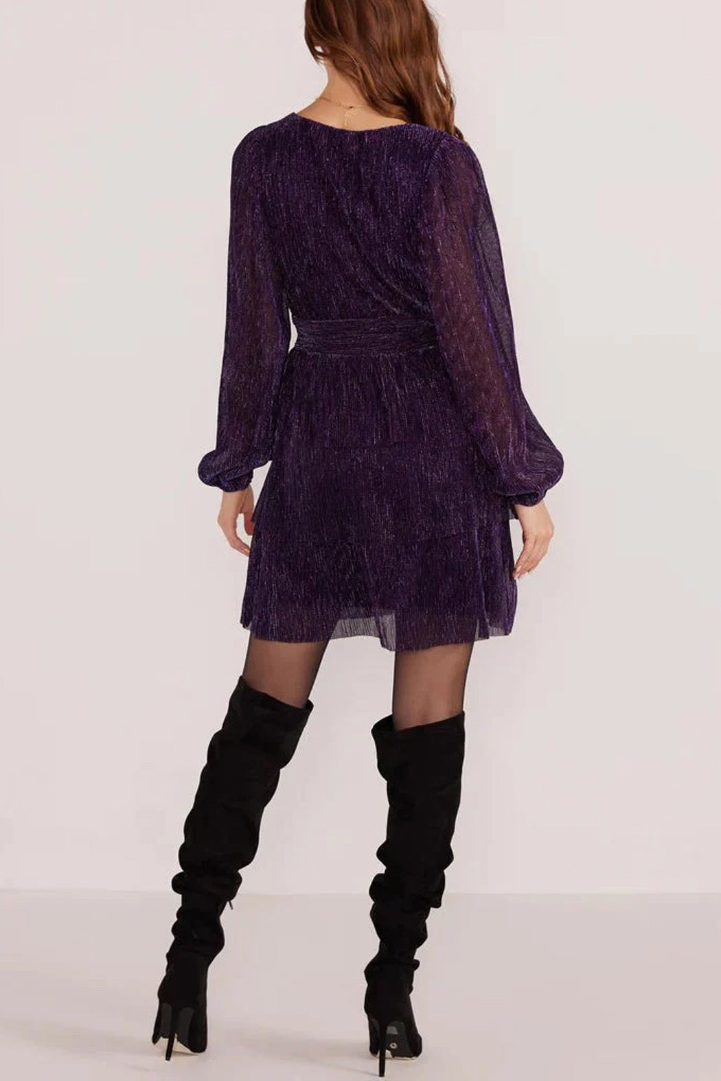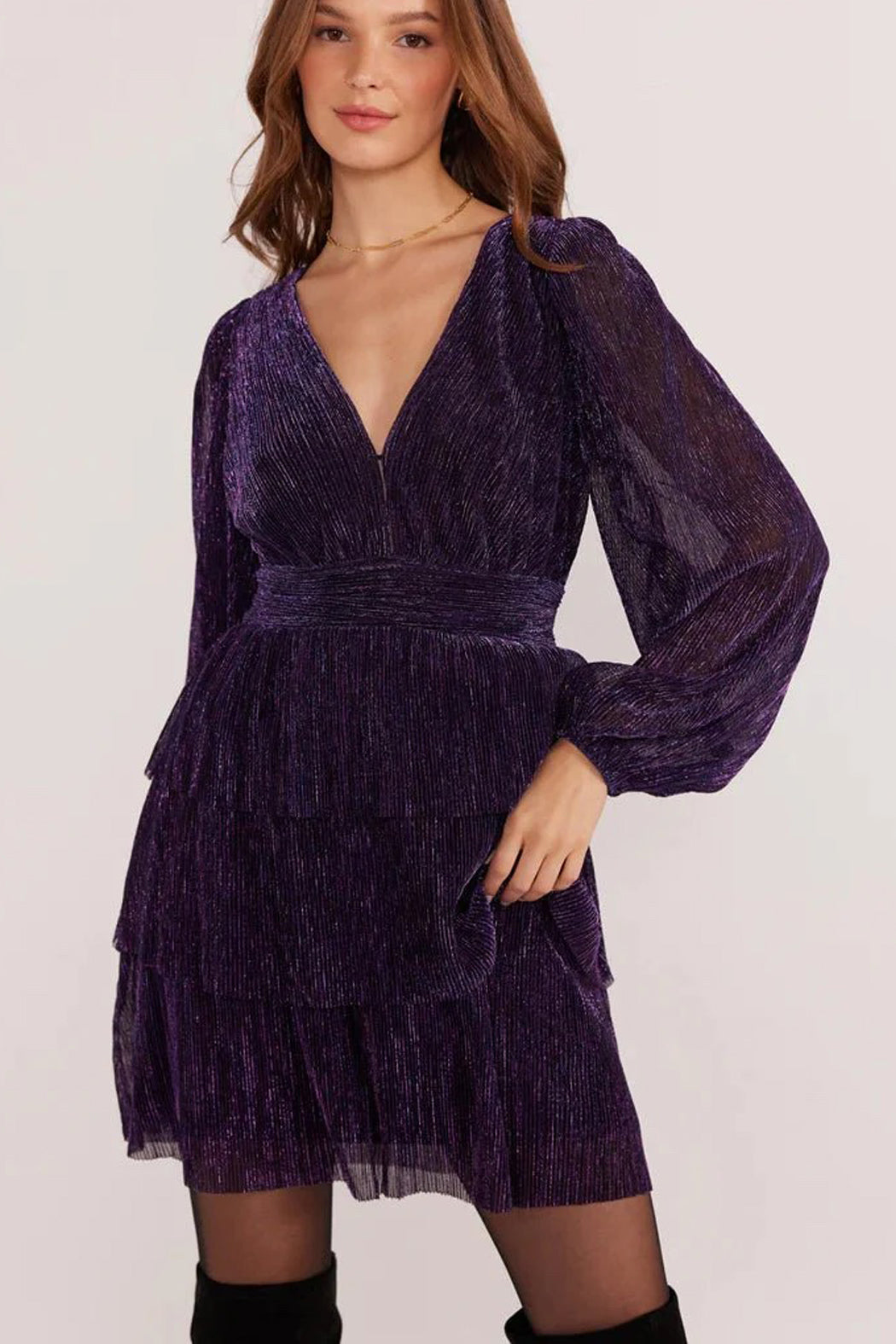 The perfect dress for a holiday party or fall wedding, this dress features a purple metallic plisse fabric with a plunging neckline, long sleeves, and tiered skirt.