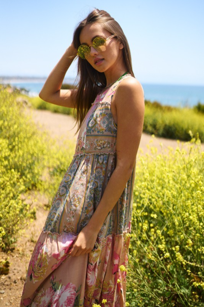 Floral boho stripe mixed full skirt maxi long dress. Model is wearing small