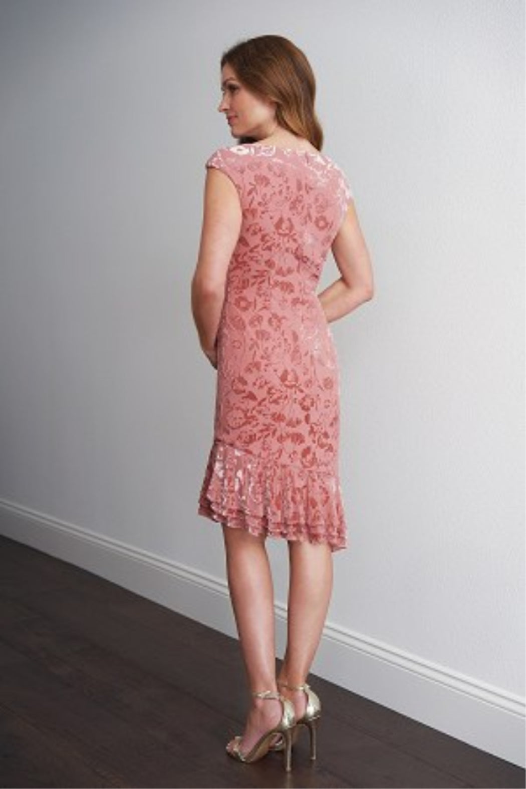 Pretty floral stretch velvet (with stretch lining) knee length Mother of the Bride dress with a scoop neckline. Layers of ruffled fabric on the bottom of the asymmetrical dress to complete the look.