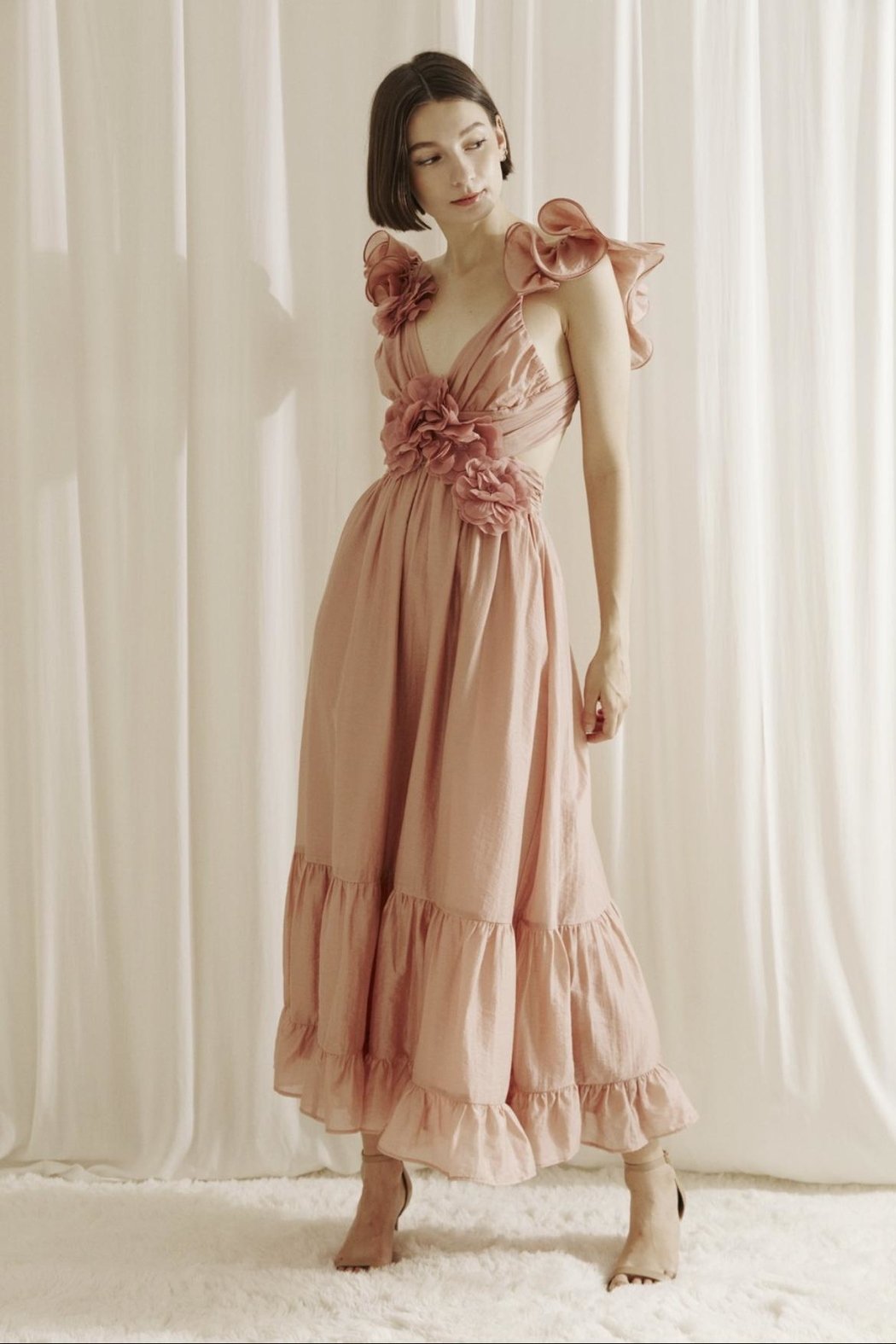 Flower detail ruffled shoulder maxi dress. Model is wearing a size Small