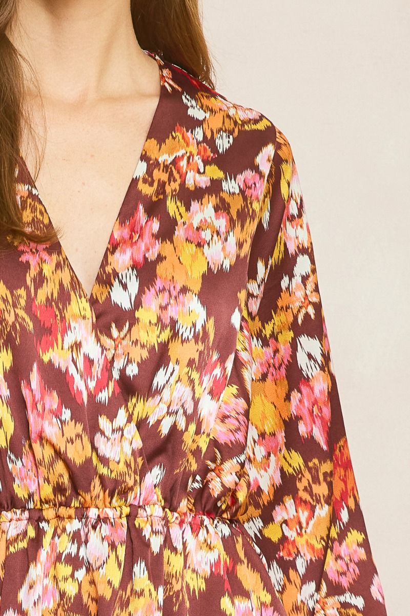 Floral print long sleeve dress featuring self tie at sides. Ruffle detail at skirt.