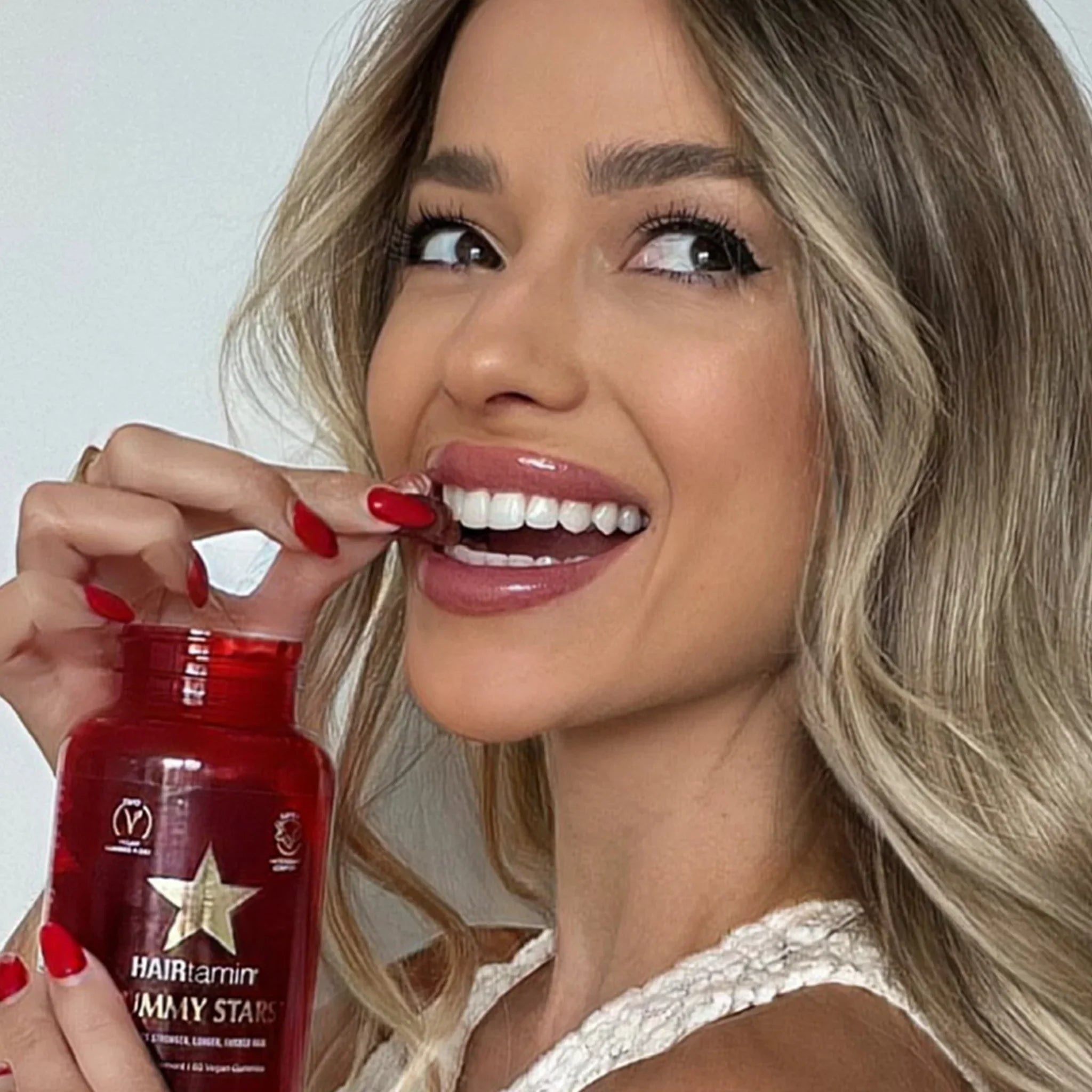 HAIRtamin® Gummy Stars™ are an award-winning, physician-formulated and delicious hair nourishing supplement with clinically-studied vegan ingredients to help maintain stronger, longer, thicker-looking hair. Our proprietary blend of essential hair-loving vitamins, minerals and herbs, plus a potent super antioxidant complex synergistically work together to help promote healthy hair growth, retention and follicle strength from the inside out.*