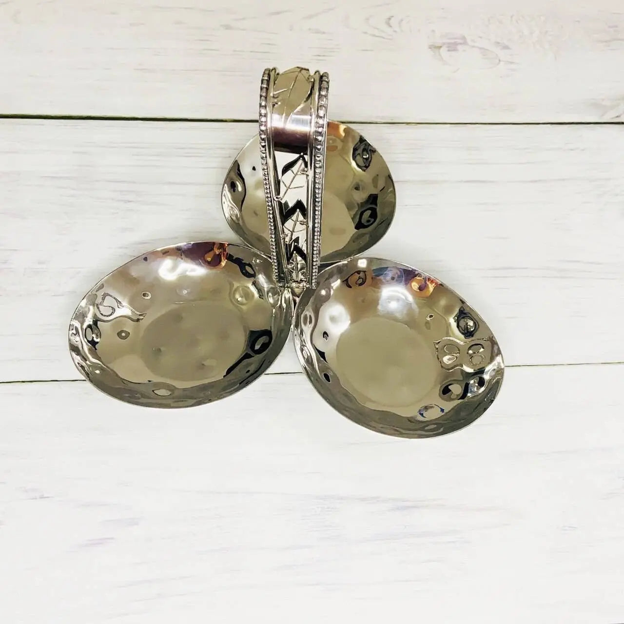 • Three hammered bowls connected by a gold-plated handle