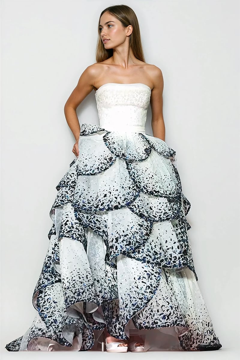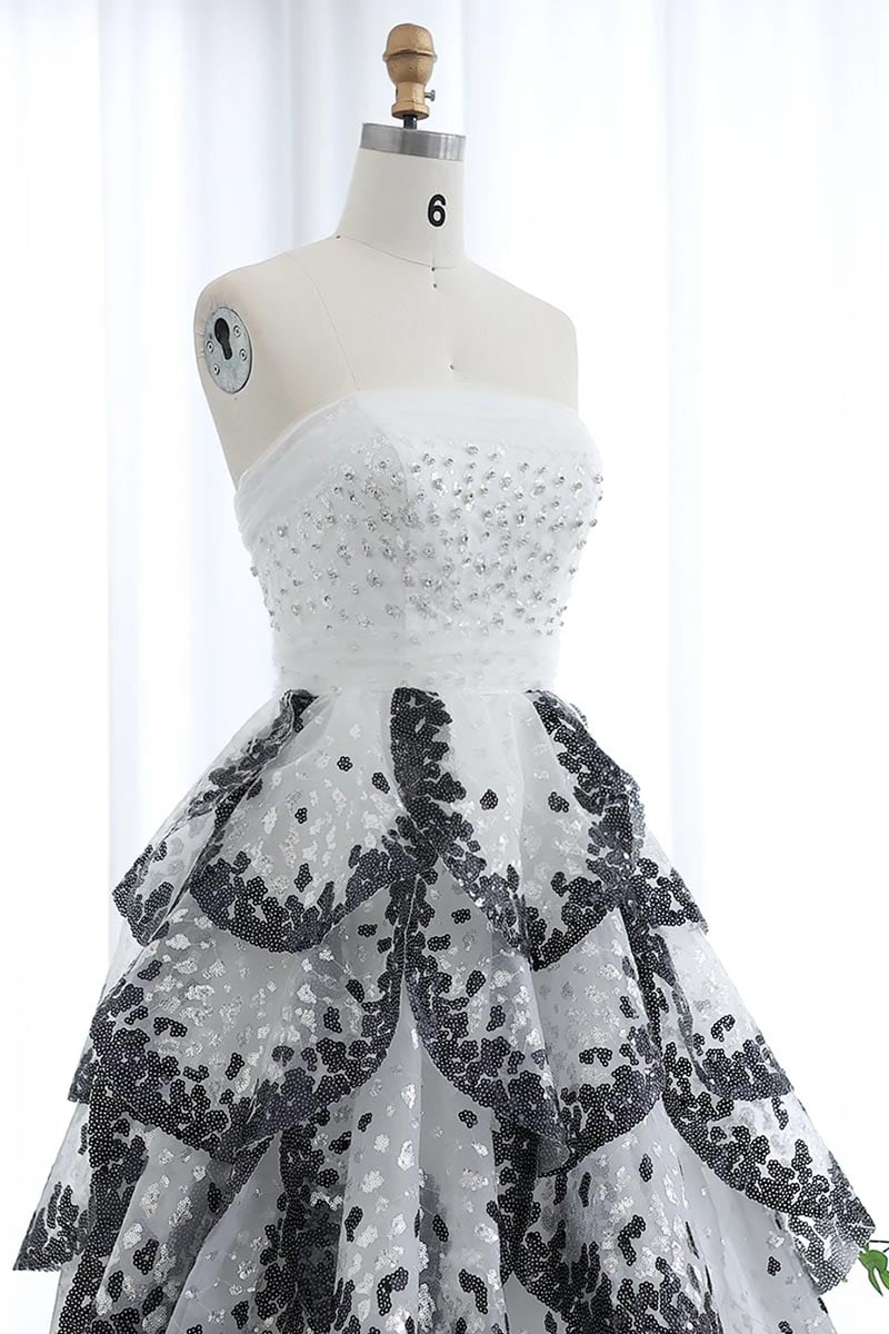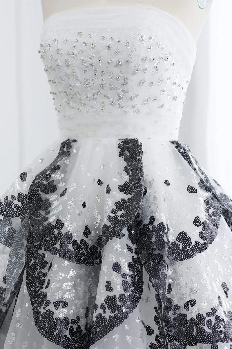 Make an unforgettable entrance in the Keep It Stunning Strapless Evening Gown, a masterpiece of modern glamour and timeless elegance. Crafted from soft white tulle and adorned with shimmering black and silver sequins, this gown radiates luxury from every angle. The embellished bodice sculpts a flawless silhouette, while the tiered petal-style skirt cascades into a sweeping train—capturing light and movement with every graceful step. Perfect for galas, couture brides, and red-carpet soirées, this gown promises to make you the center of every celebration..