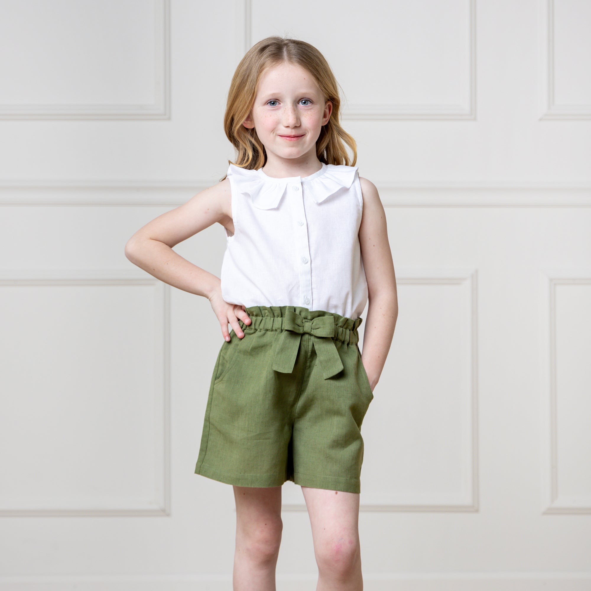 Our easy breezy cinched waist short in a soft organic cotton linen blend will keep your girl comfortable all spring and summer long. Features paper bag styling, side pockets, a waist tie with bow, and elastic at the back waist for easy on and off. Pairs beautifully with our flowy knit tops!