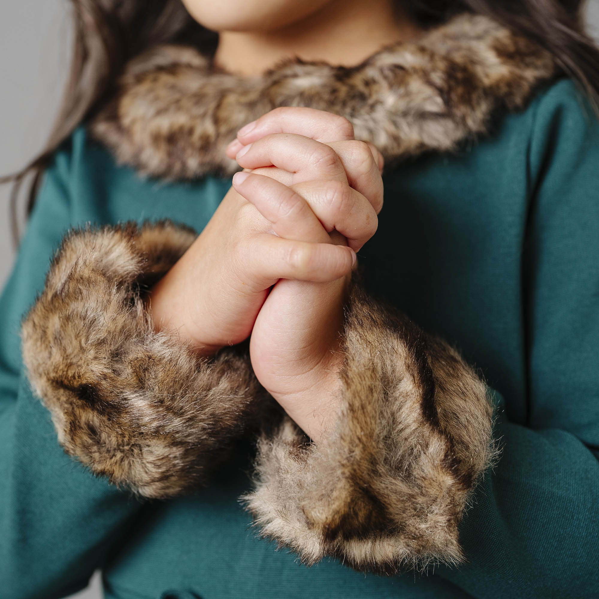 • Faux fur cuffs and collar. Back zip closure.