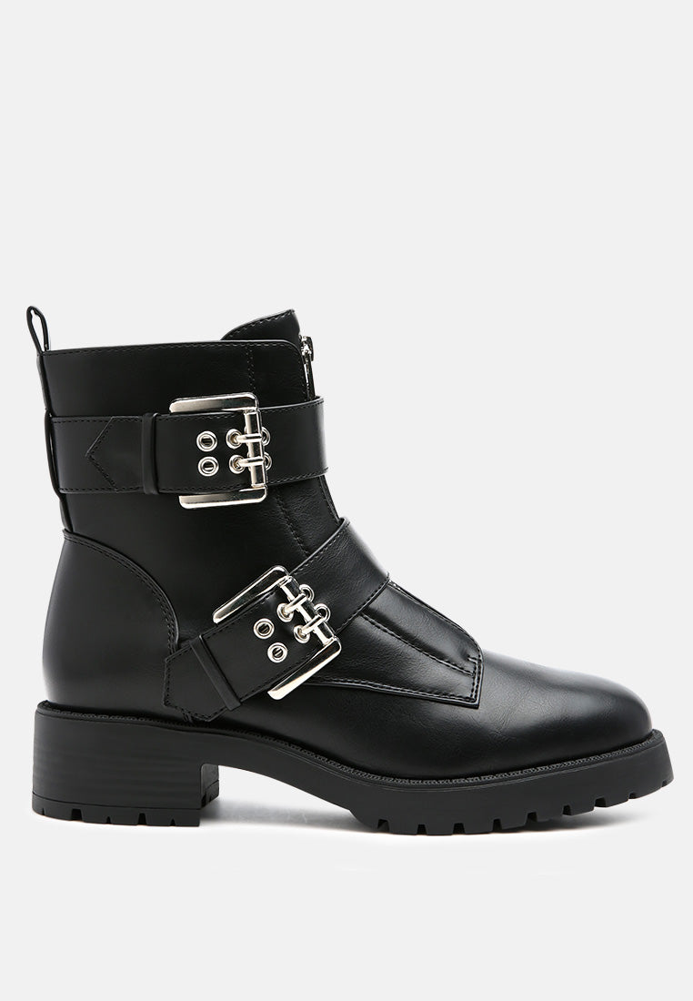 The solid black boot with metallic buckle details and side zipper opening in durable and well-constructed TPR outsole. The eye-catching metallic zipper on the top adds to the flexibility and look.