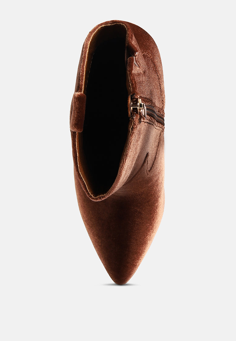 Absolute treat to the winter wardrobe the velvet ankle cow girl boot adds much needed brightness to the dull winter. Comes with side zipper opening on the inside which makes it easy to wear. The high heeled stiletto boot has elasticated gussets which fit well along the ankle.