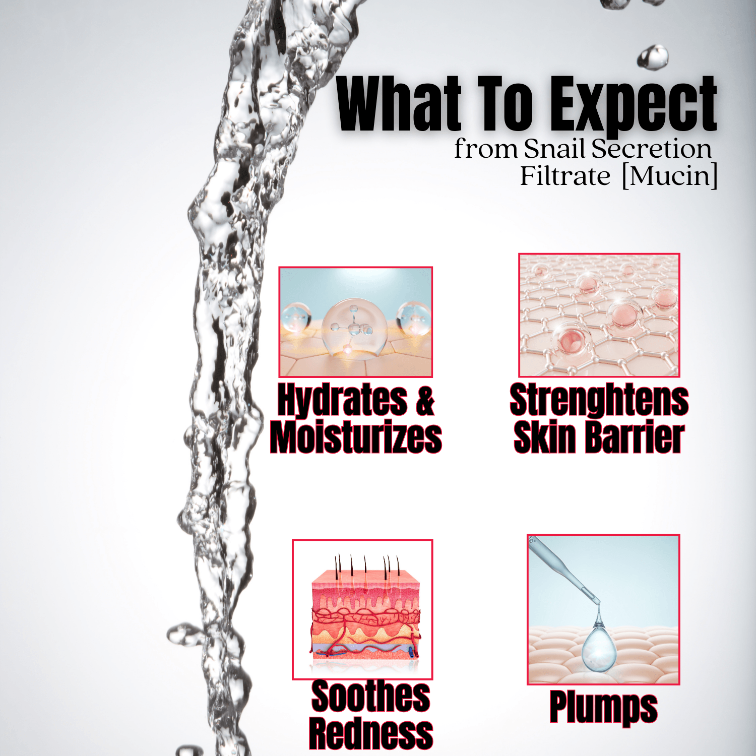 - 98 % Snail Secretion Filtrate: Rich in mucopolysaccharides, proteins and peptides that deliver intense hydration, support collagen synthesis and accelerate barrier repair.