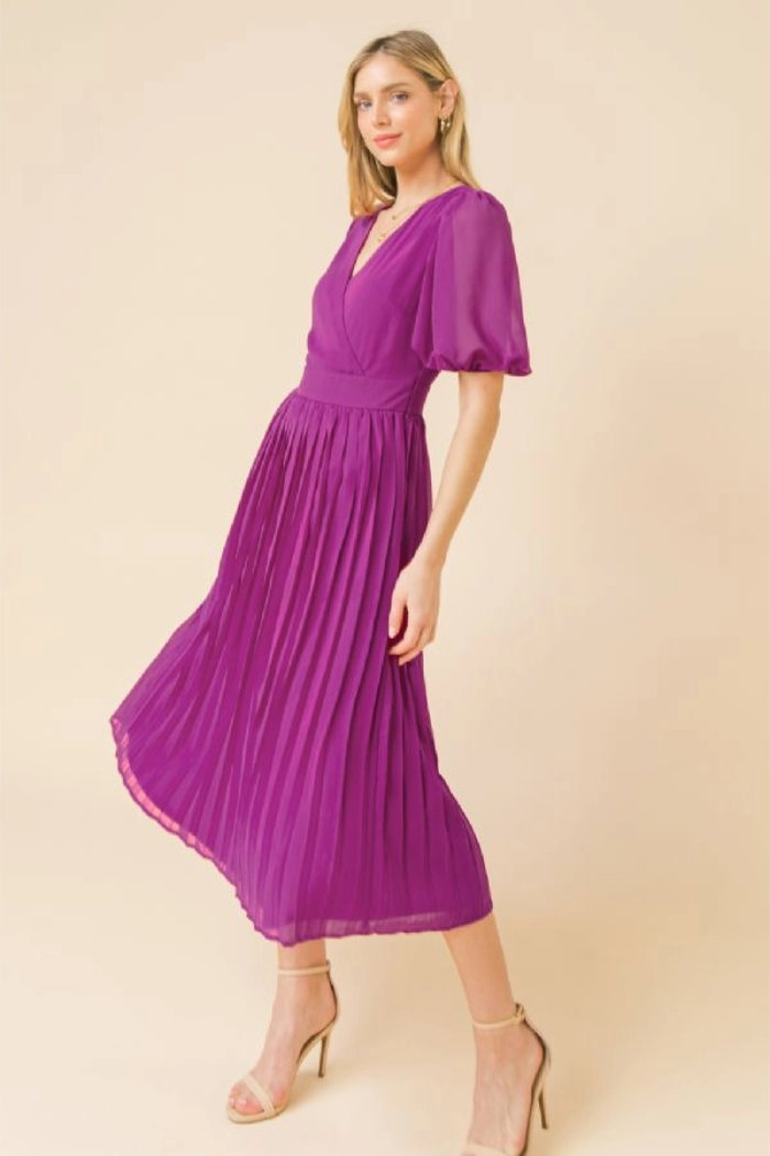 In need of a beautiful and effortless dress to wear in those special events? Our magenta dress won't disappoint you! This easy to wear dress features a gorgeous solid Magenta color, front surplice neckline, waist band, short puff sleeves, pleated skirt, midi length and side zipper closure, material has stretch, fully lined. Model is 5'8" and wears size Small L: 50" B: 28" W: 35"