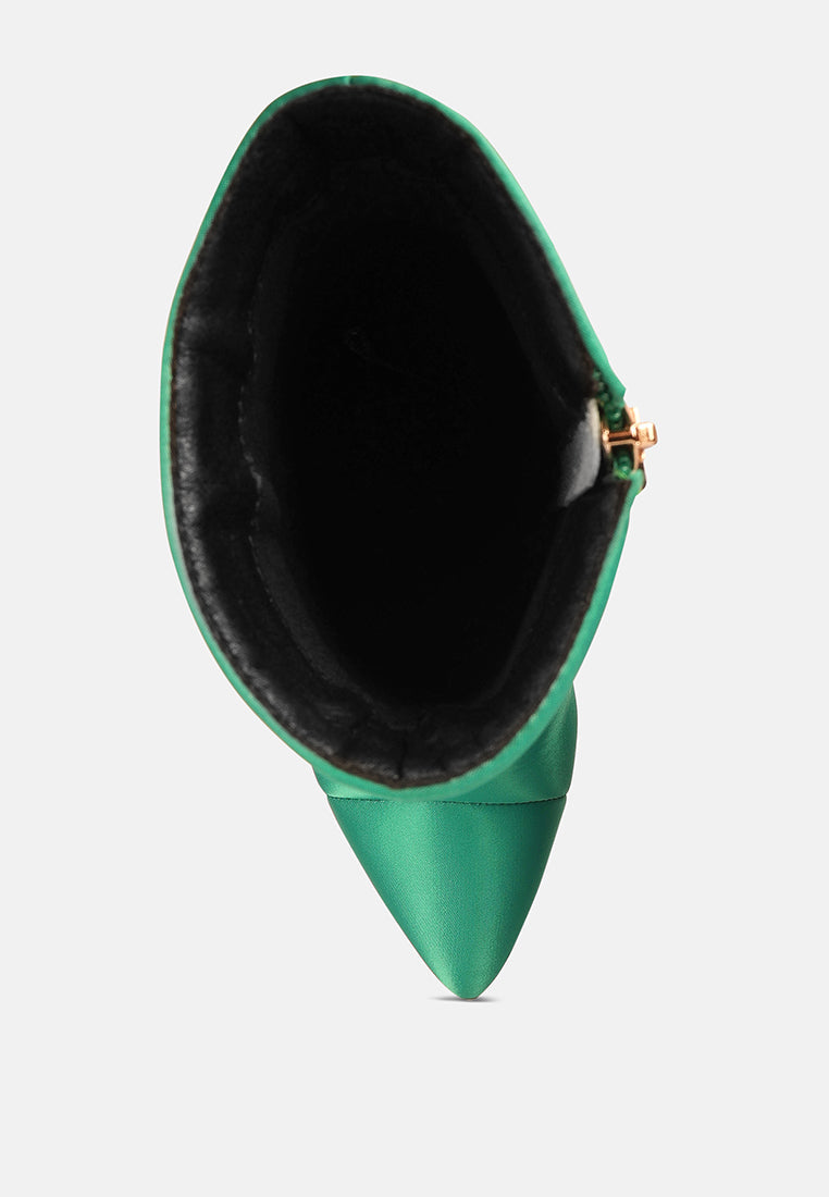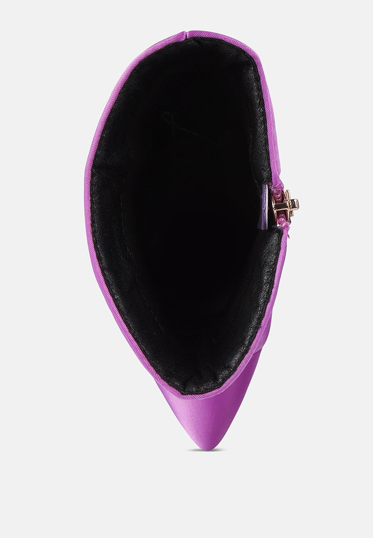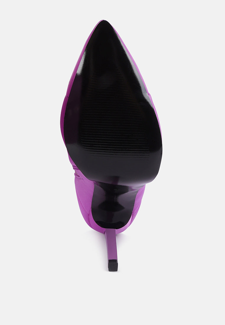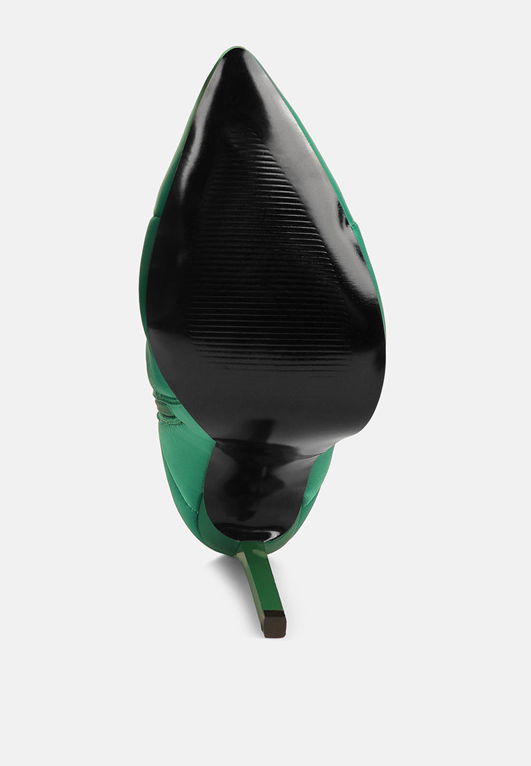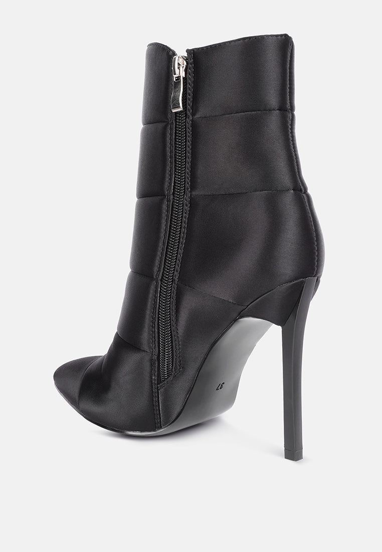 Fashionable and chic: high pointed heeled ankle boots crafted with quilted satin which insulates you well as mercury dips! The pointed-toe bootie looks sharp with its stiletto heel. Comes with side zipper opening which makes it easy to wear.