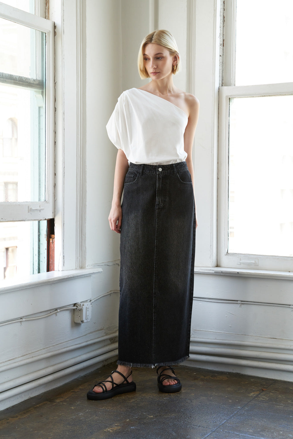 A washed denim midi skirt featuring front closure, side and back pocket and frayed hemline