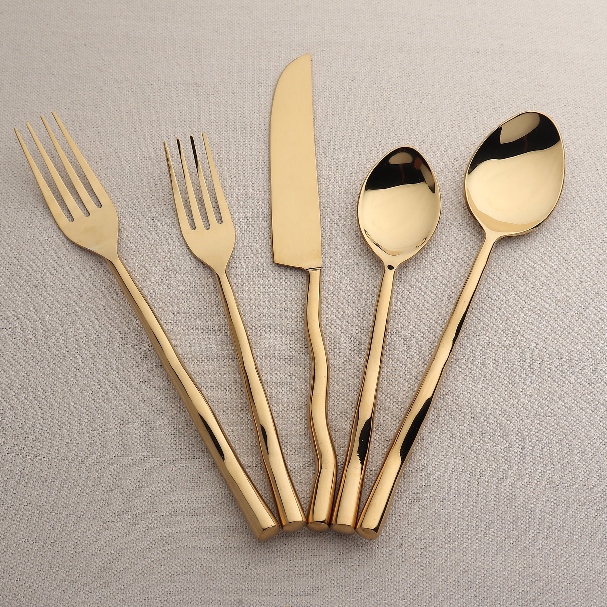 Tedpole PVD flatware features a whimsical design that enhances modern dining experiences. This artisan-crafted flatware has wavy handles, which contribute to a unique and playful aesthetic. Made from stainless steel with a beautiful PVD finish, the lively contours of the handles create a captivating play of light and add a fresh, artistic touch to your dining table.