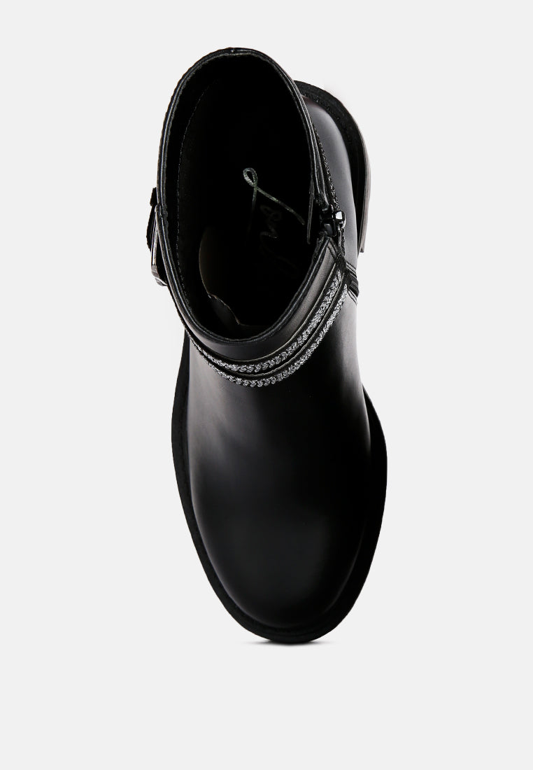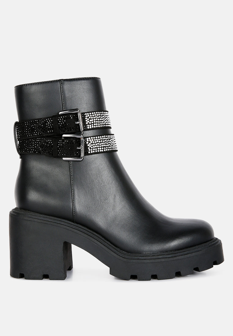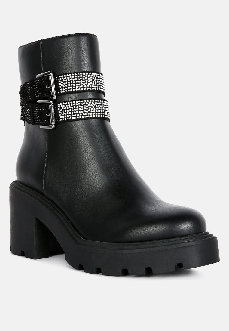 The most popular fashion trend is Ankle Boot with Zipper and Ankle Straps Dotted with Chunky Diamante, which adds a sparkle to any casual look, and Side Zipper adds a fashionable touch. Block heels and a rugged sole provide extra traction, and the Lightly Padded Insole ensures all-day comfort.