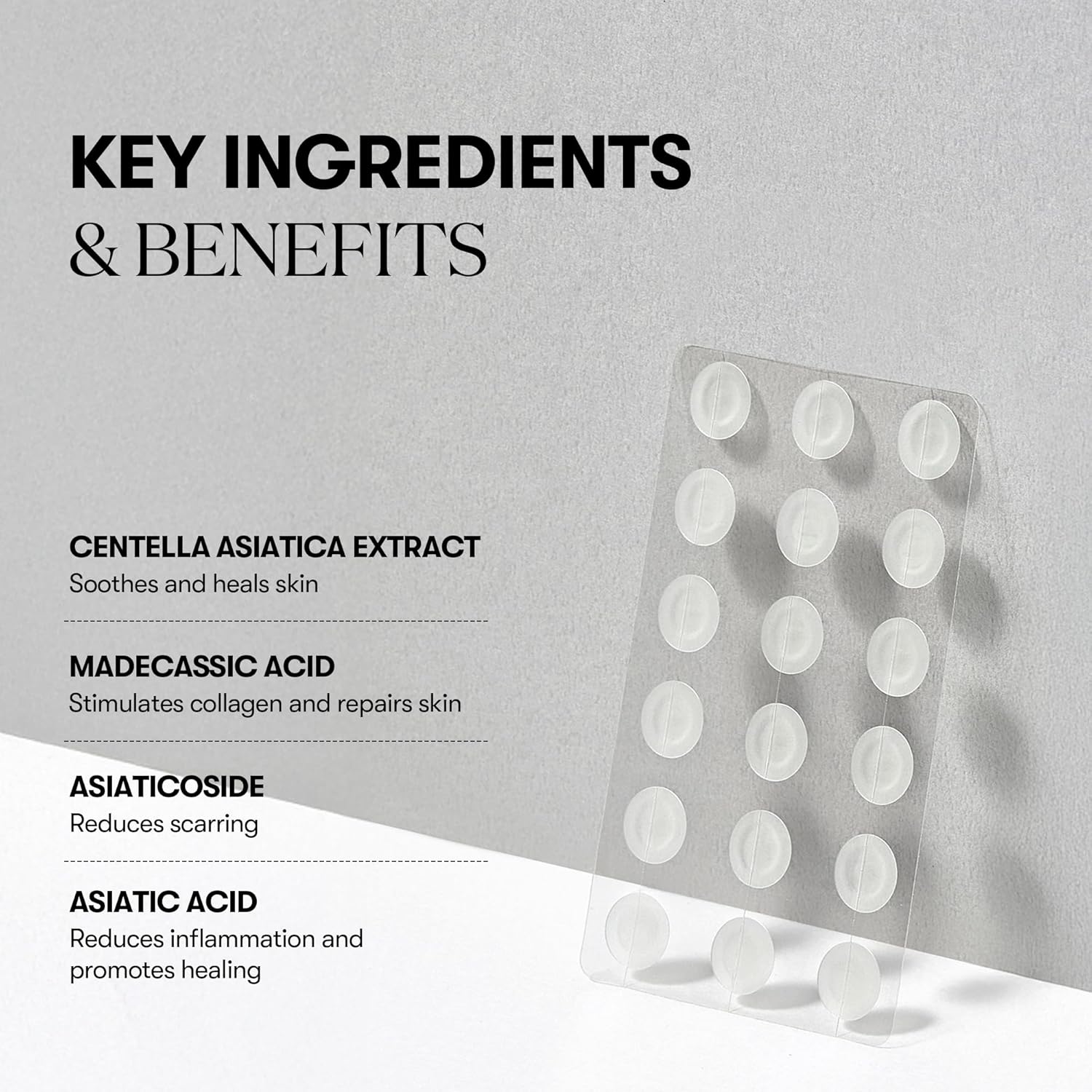 - Hydrocolloid patches with centella asiatica absorb fluids and protect acne spots to aid recovery