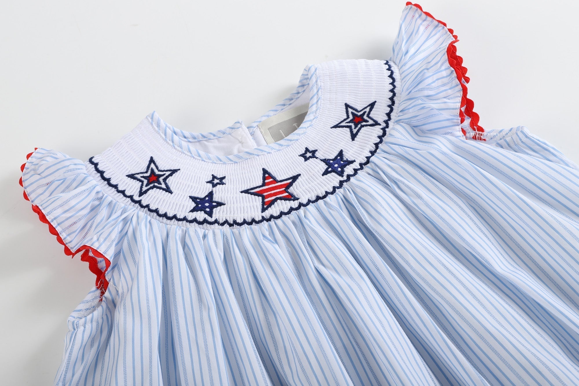 4th of July Blue Striped Stars Smocked Bishop Dress