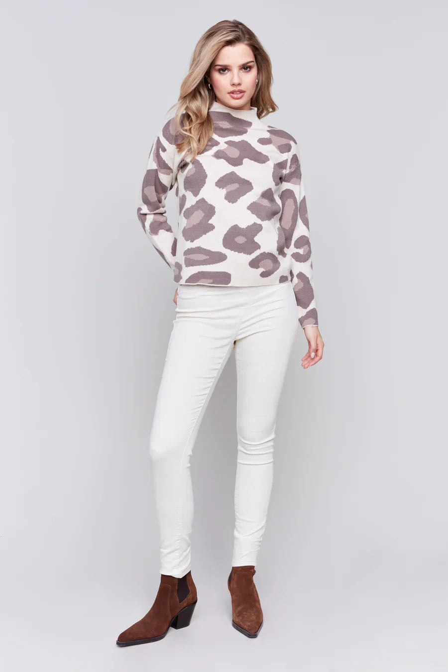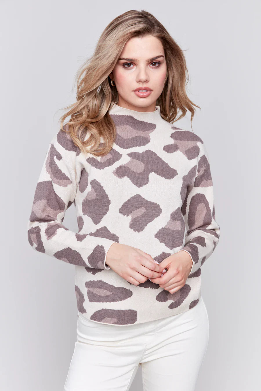 Embrace bold style with the Charlie B Animal Jacquard Mock Neck Drop Shoulder Sweater. This standout piece features a striking animal jacquard pattern, offering a chic and modern twist to your wardrobe. The mock neck provides a touch of sophistication, while the drop shoulder design ensures a relaxed and comfortable fit. Perfect for layering or wearing on its own, this sweater combines fashion-forward elements with cozy comfort, making it a versatile addition to any outfit.