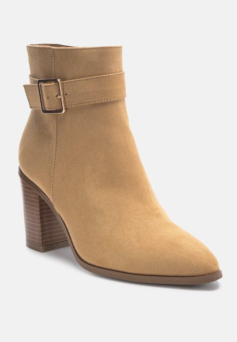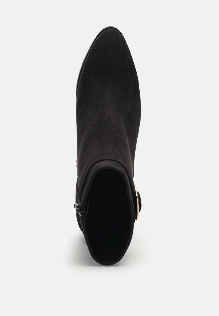 Aesthetically pleasing the faux suede pointed toe boot with buckle detail is stylish pick. The side zipper opening makes the block heeled boot an easy to wear design which is built with quality outsole and comfortable lining.