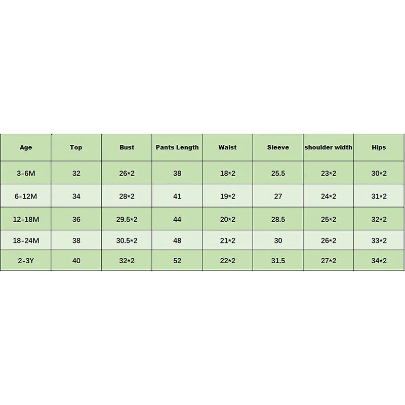 3-6M Tops Length: 12.6 Bust: 20.47 Pants Length: 14.96 Waist: 14.17 Sleeve: 10.04 Shoulder: 9.06 Hip: 23.62 Advised Age: 3-6 Months