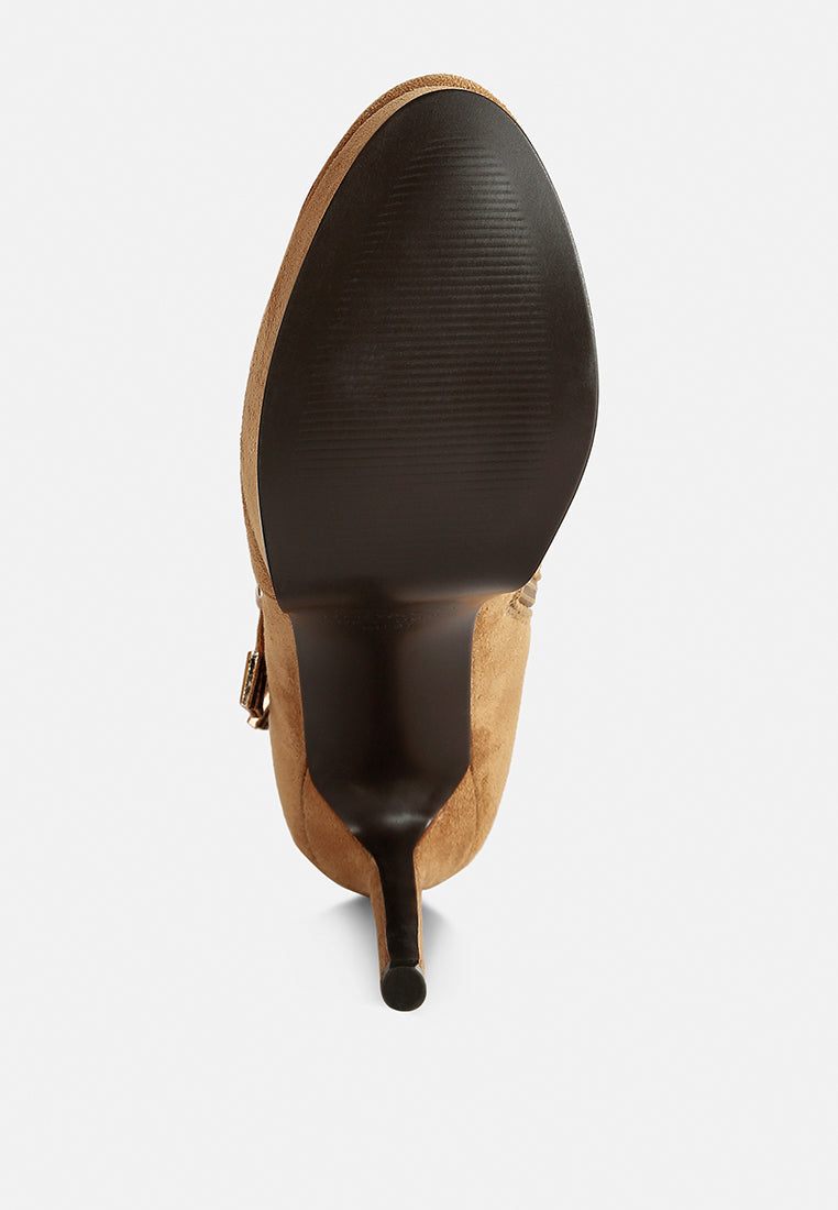 The boots have a three-strap buckle design which gives it a bold look. The stiletto platform heels make the boots the perfect fall party wear. The zipper closure makes them easy to wear as well.