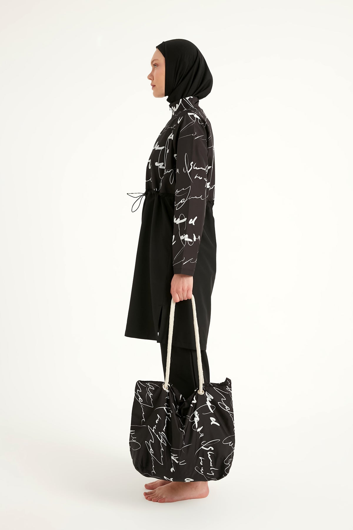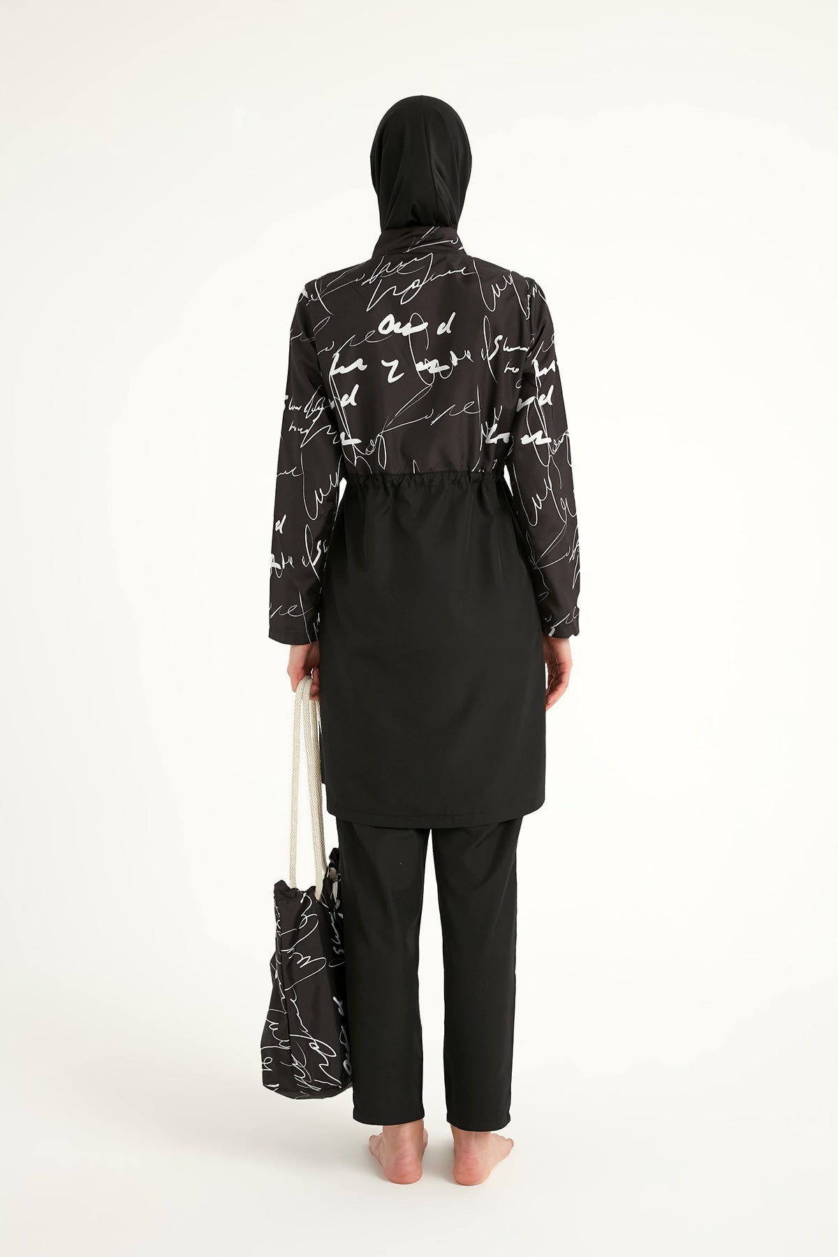- Set includes: tunic, pants, swim cap, beach bag
