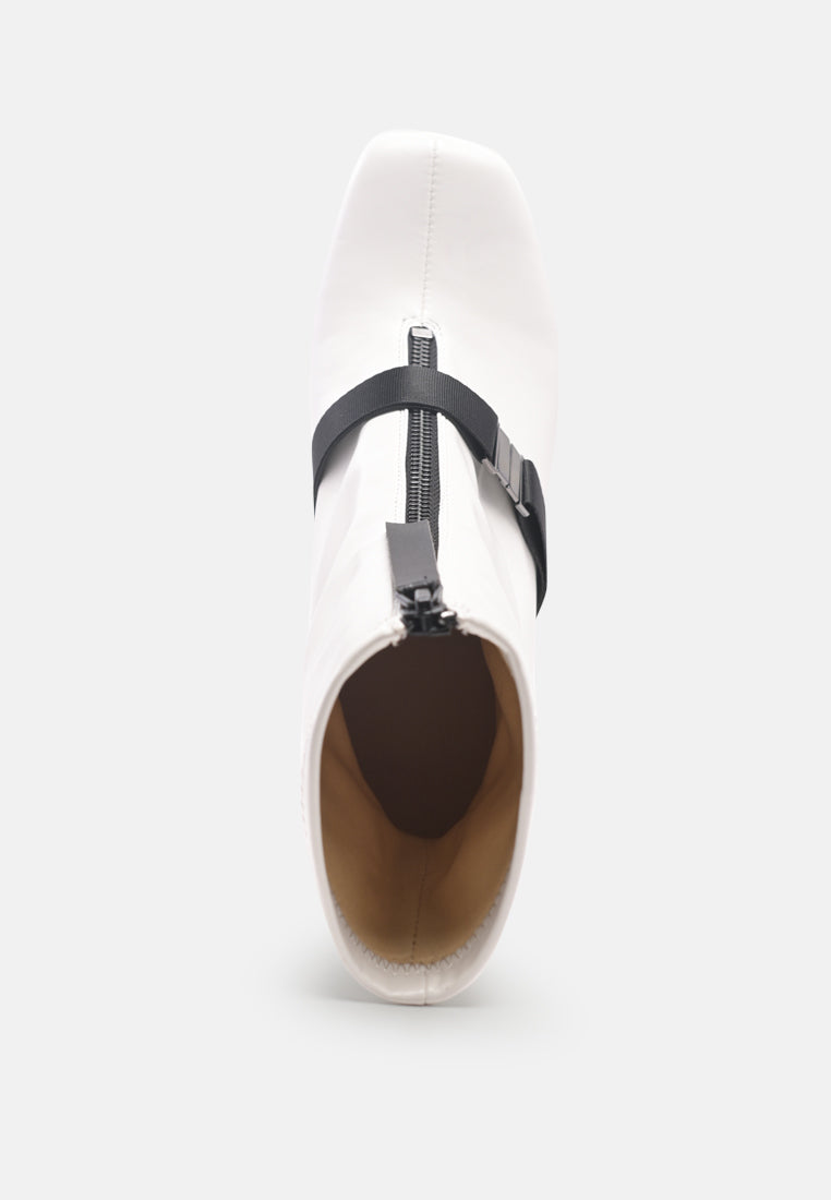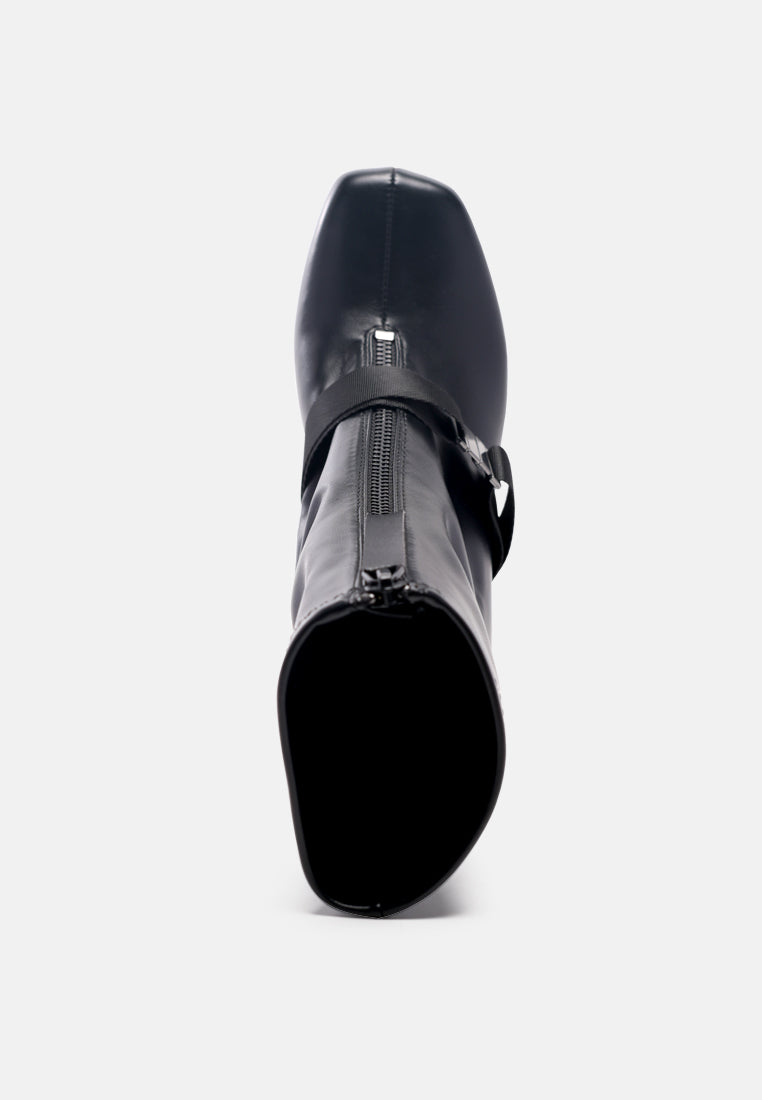 Wanting to make a statement? Our Boomer Chunky High Block Heel Boots are just the women's boots you want. The buckle strap detail amps up your game. The front Zipper is provided for easy access. The front elevation and block high heels give you the desired height. Pair them up with a nice flowy dress or denim and bewitch anyone around. A lightly padded insole adds to your comfort.