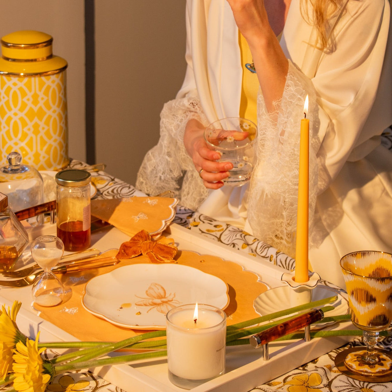 A solitary bumblebee, intricately sketched, claims a central place on a white scalloped plate. Whether it's a sunlit breakfast or a candlelit dinner, this plate - a prelude to the 'Bumble Voyage' dinner plate - brings a touch of summer's fleeting beauty and the tireless dance of the bumblebees.
