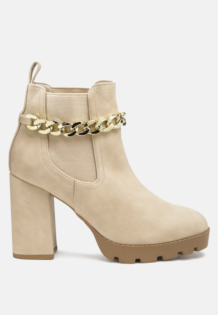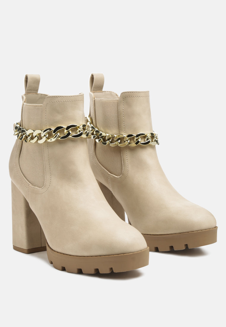 Chelsea Boots with Block Heels and Golden Chain at Ankle-Length to Complement your outfit.