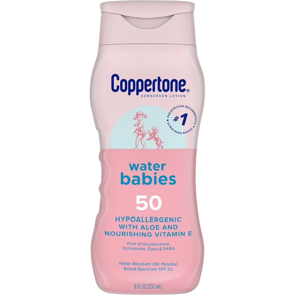 No. 1 pediatrician recommended sunscreen brand. Hypoallergenic with aloe and nourishing vitamin E. Free of Oxybenzone, Octinoxate, Dyes & PABA. Water resistant (80 minutes) Broad Spectrum SPF 50. Broad Spectrum UVA/UVB Protection. www.coppertone.com. how2recycle.info. Questions? 1-866-288-3330.