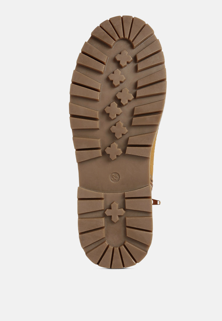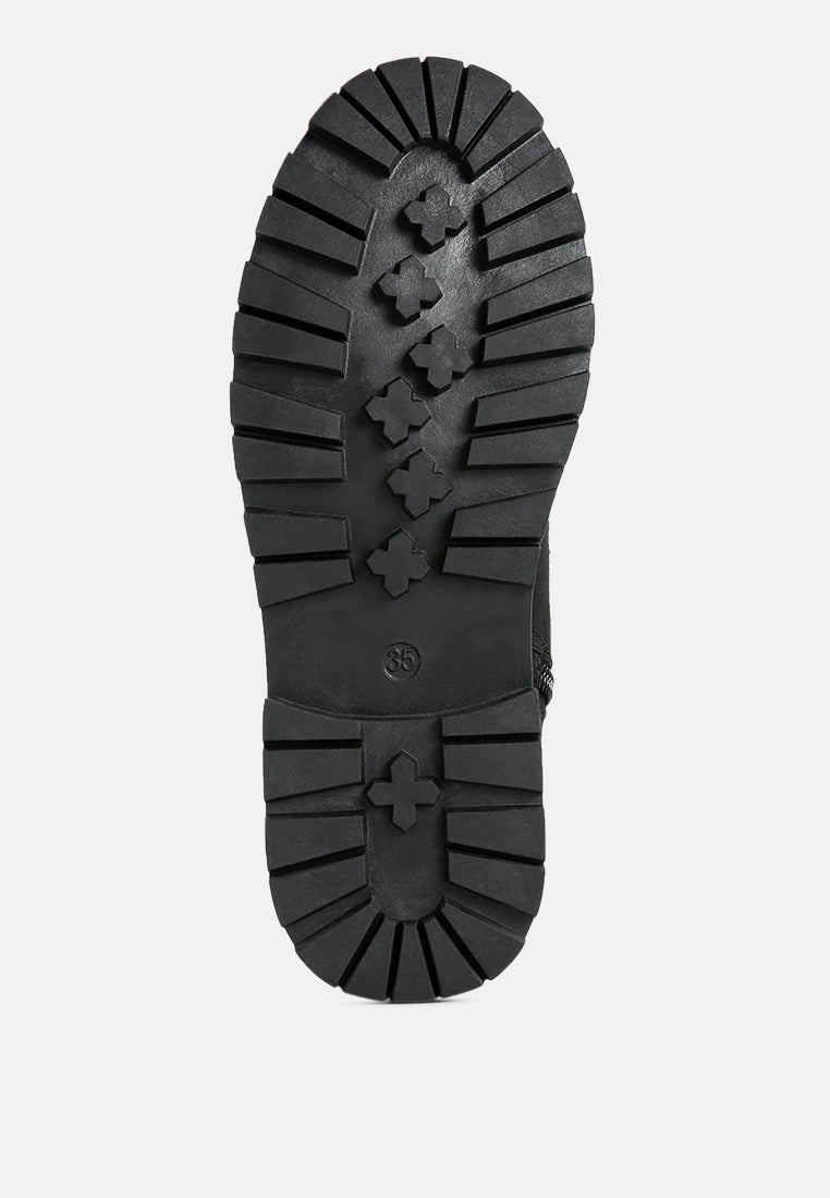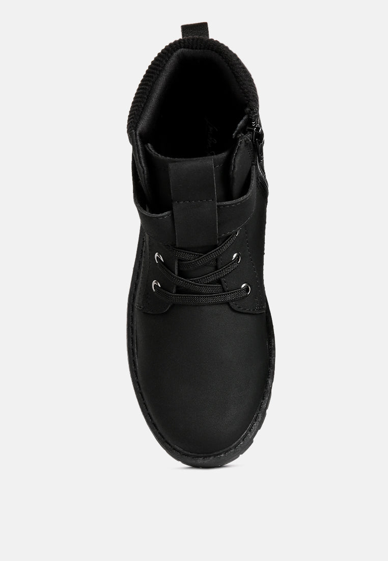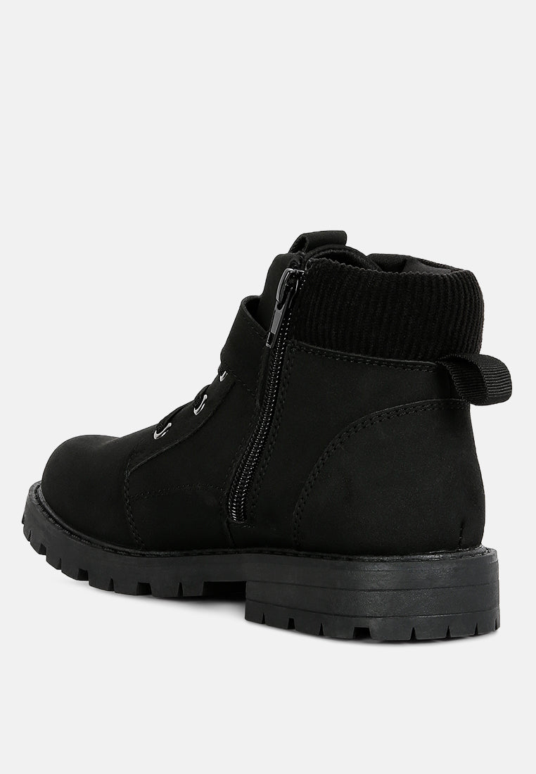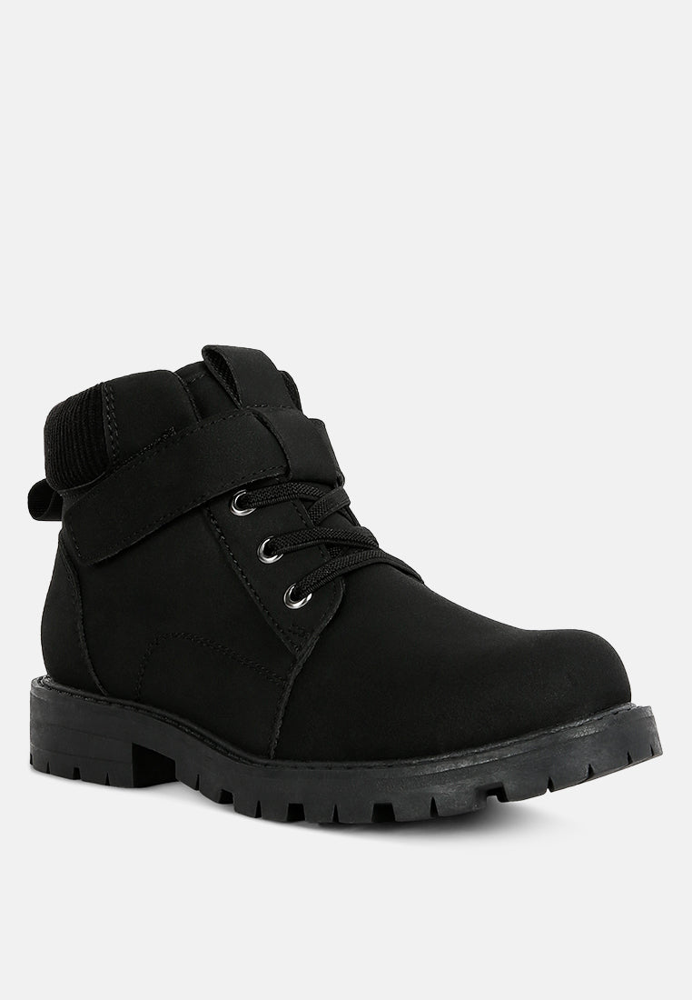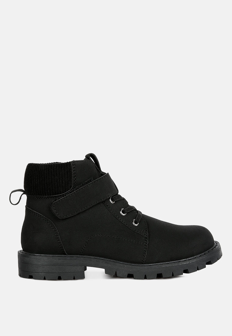 Cushion collared ankle boots with hook and loop fastening straps , it has lace up detail for the looks. The side zipper fastening helps for easy opening. The rubber outsole is anti skid on all surfaces.
