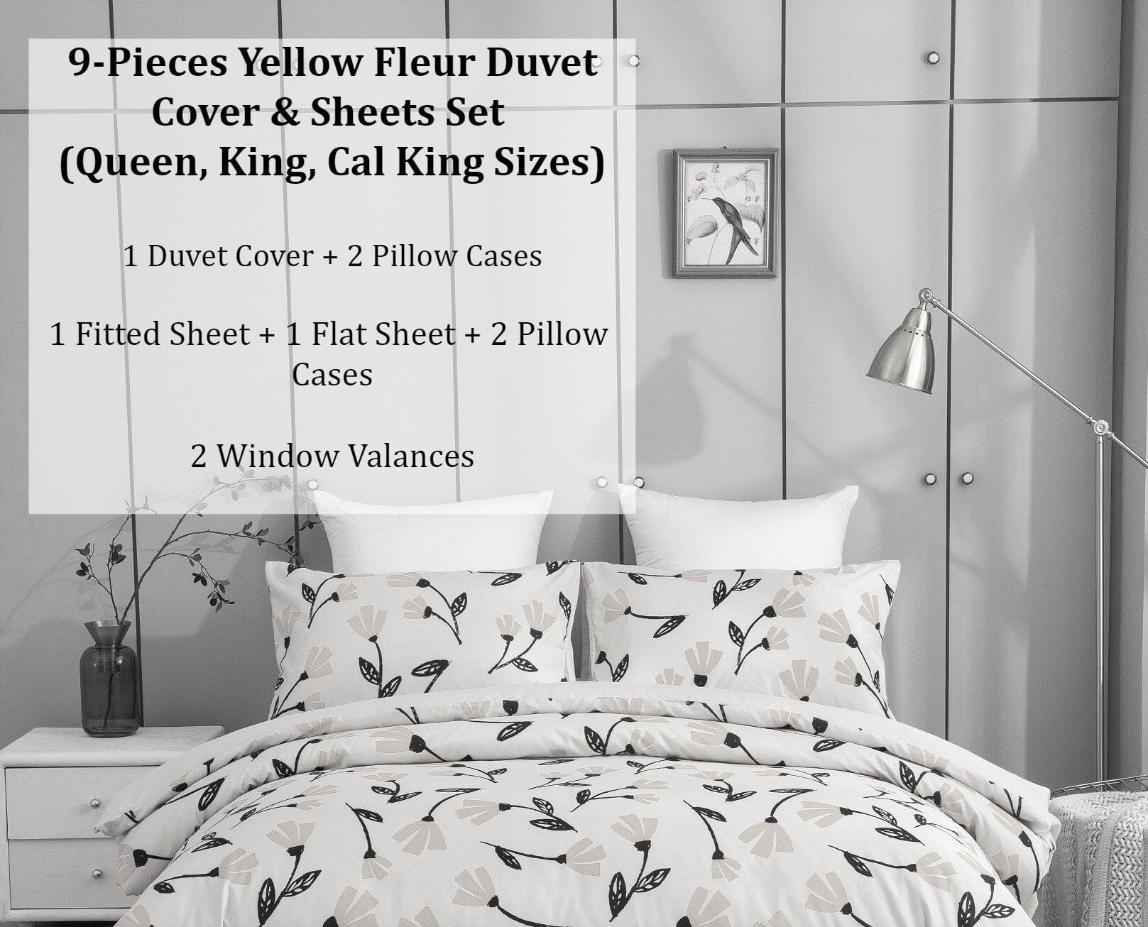 DaDa Bedding Yellow Fleur Golden Orange Botanical Ivory Duvet Cover & Fitted Flat Bed Sheets Set w/ Pillow Cases Window Valances (18112)
