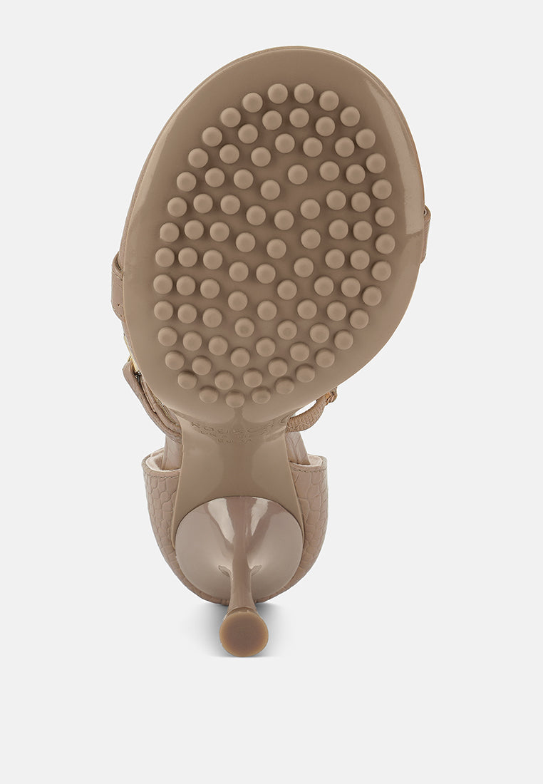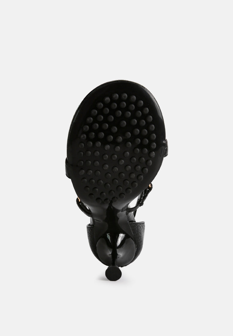 High-heeled metal chain detail sandal. The T strap heeled sandal has a sturdy design and looks beautiful and has an easy-to-wear back zipper opening. It has??groovious??insock, edge line, and outsole; comes in all Black, White, and Latte tones to choose from