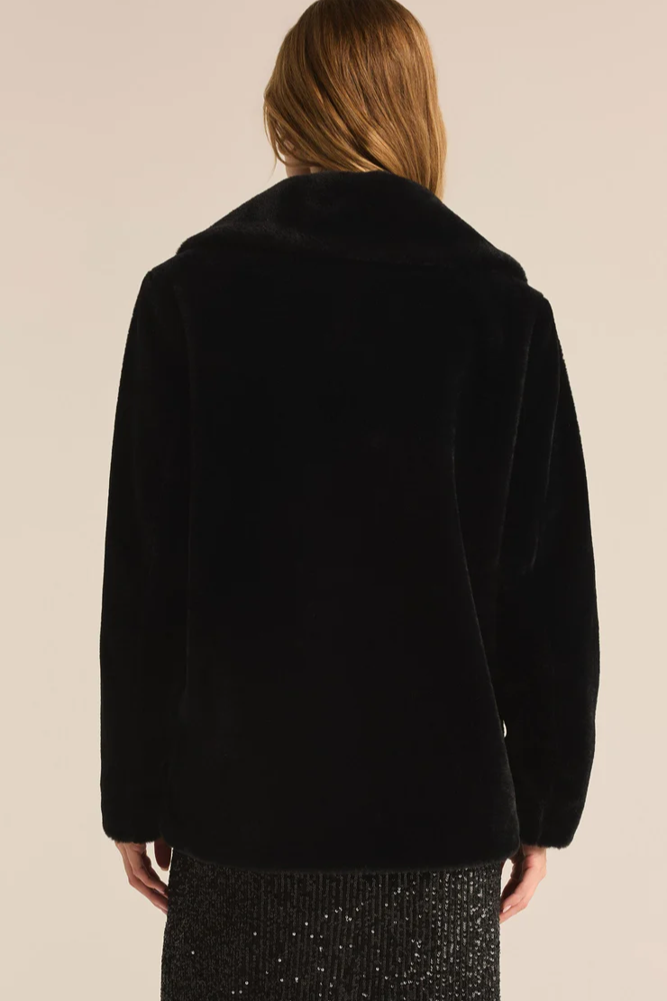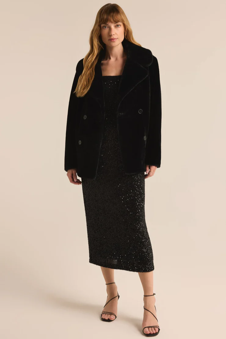 Take your cool weather wardrobe to the next level with this relaxed faux fur coat, featuring a classic double-breasted design and plush, midweight fabric. Lined for comfort and warmth, it’s the perfect statement piece for both day and night.