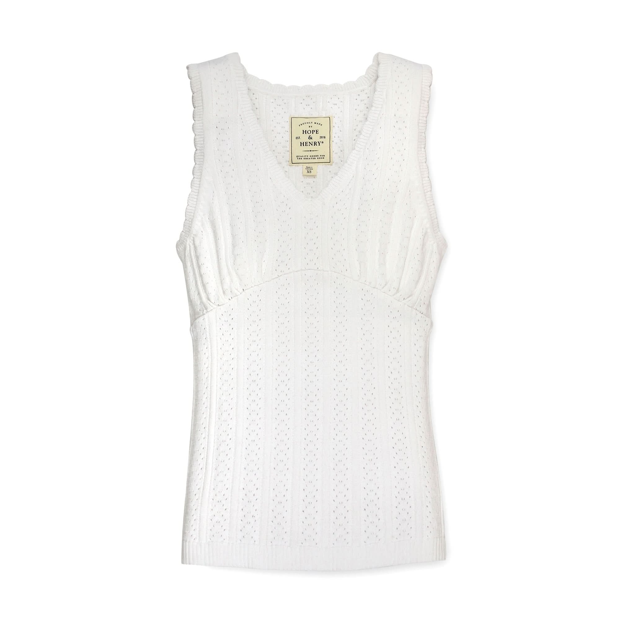 Our beautiful pointelle sweater tank is made of super soft organic cotton with a touch of stretch that hugs you in all the right places. Features a flattering v neck, scallop detail trim, and a snug fit throughout. This flattering sweater tank looks great on its own or layered under your favorite cardigan!