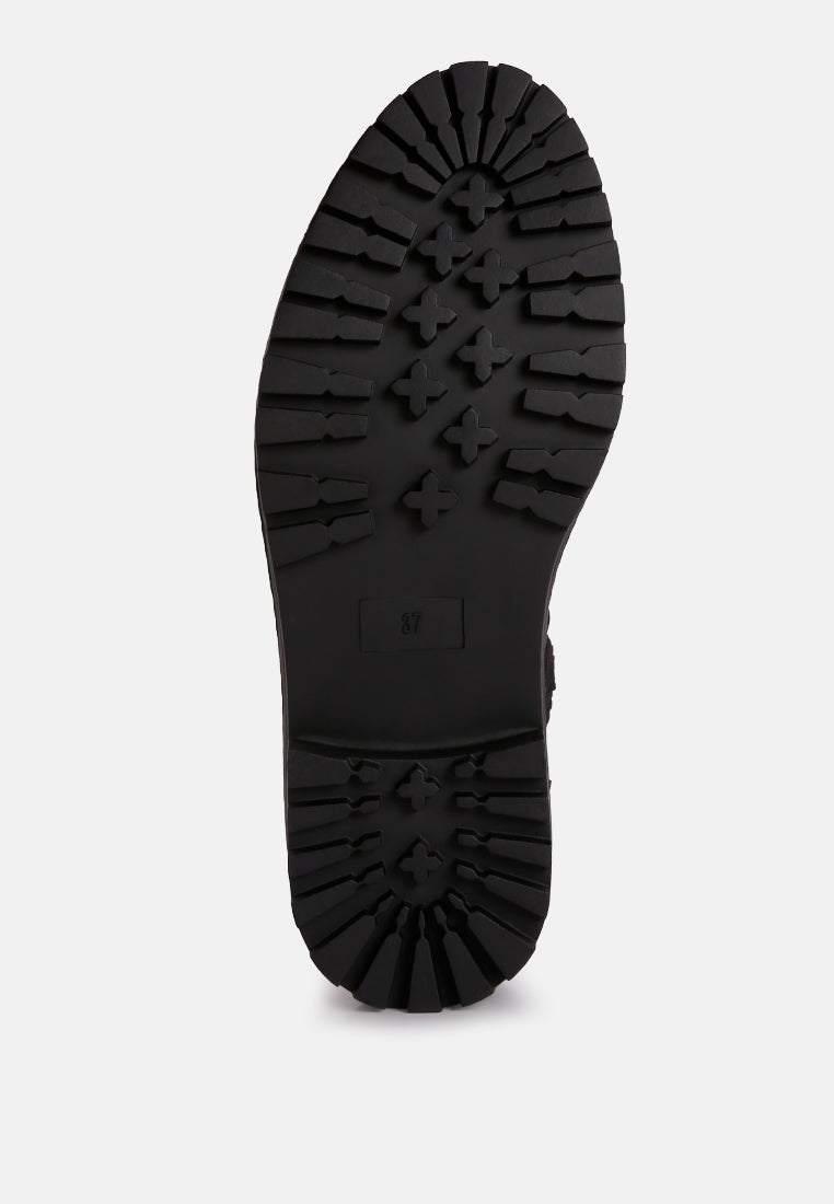 Gatlinburg Shearling Collar Ankle Boots are ideal for a fun night out. These combat boots have metallic eyelets which make this multipanel ankle boot look absolutely beautiful. It has stitch line detail on the ramp which adds to the look. These combat boots are a great match with a tight skirt or some tight pants. Giving ultimate flirtatious vibes these chunky boots will make you lead the way through and through.