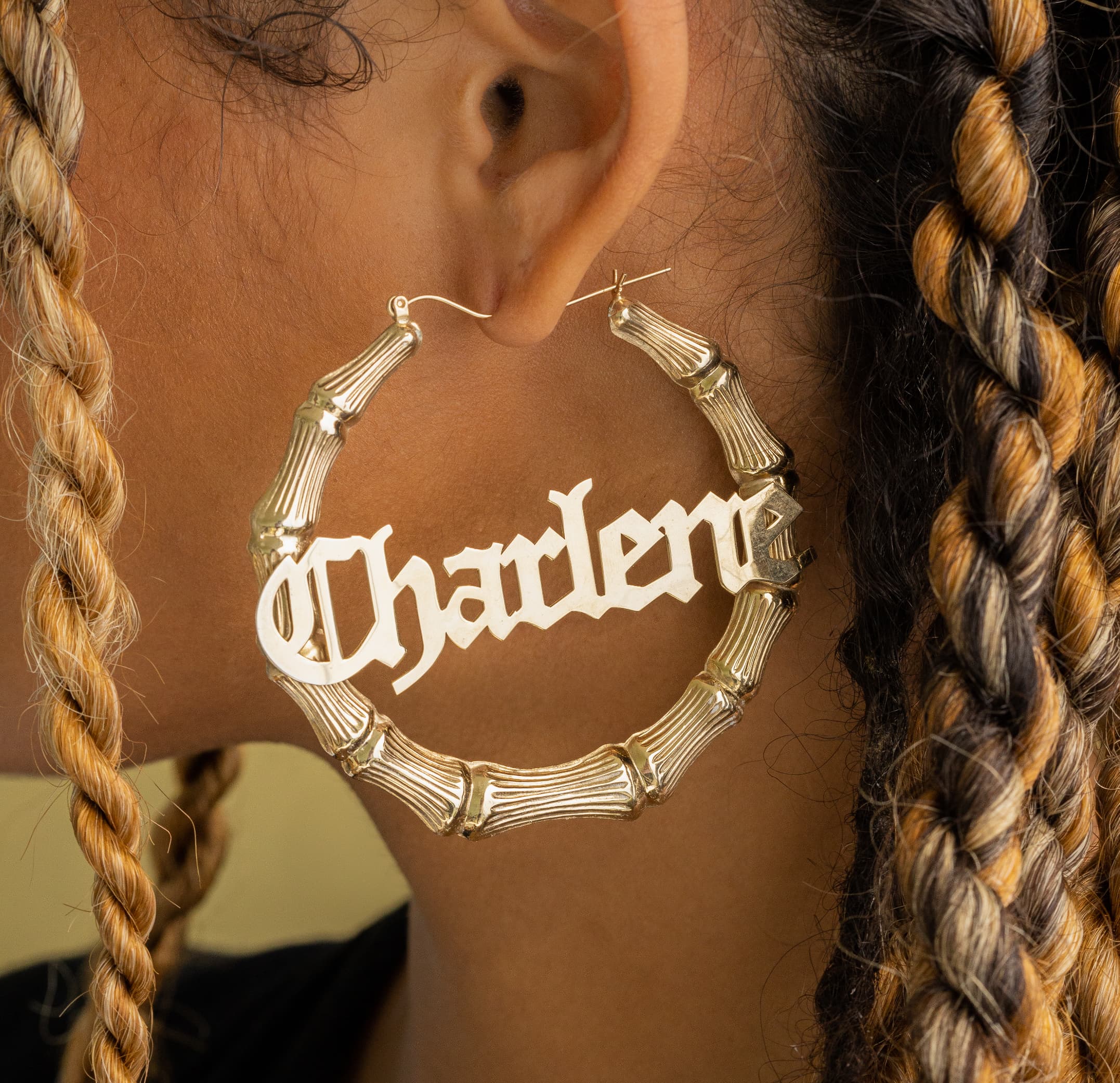 Model is wearing a 2" inch bamboo hoop.