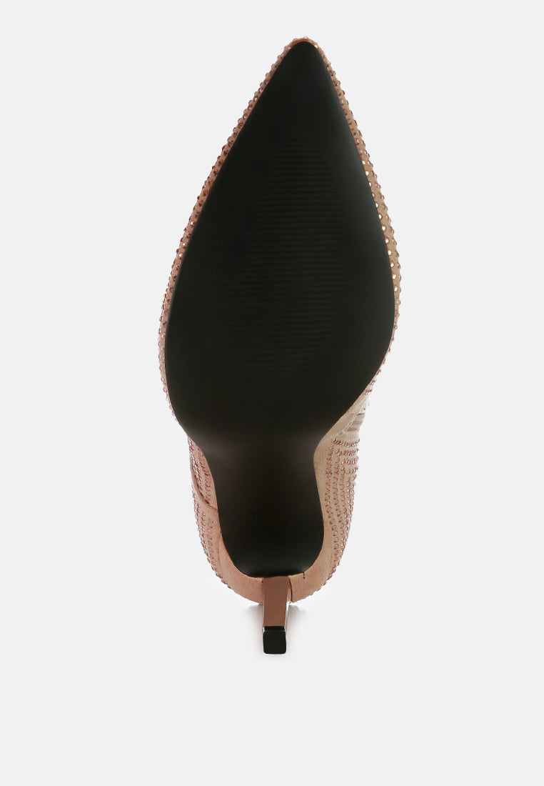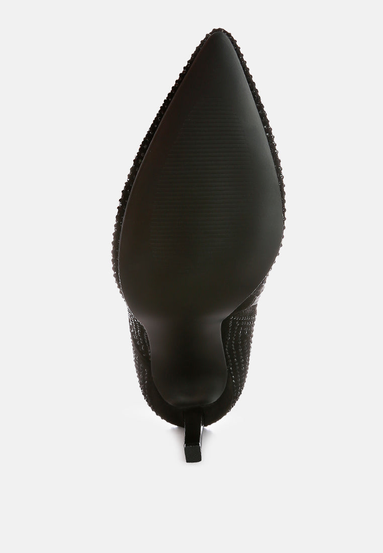 Jazz up the pre-fall with these stylish high-heeled pointed-toe booties in your wardrobe. The ankle boot with pointed toes is sharp and looks chic. The faux suede boots are tied up and have diamante details all over and come with a side zipper opening over the lace-up detail!