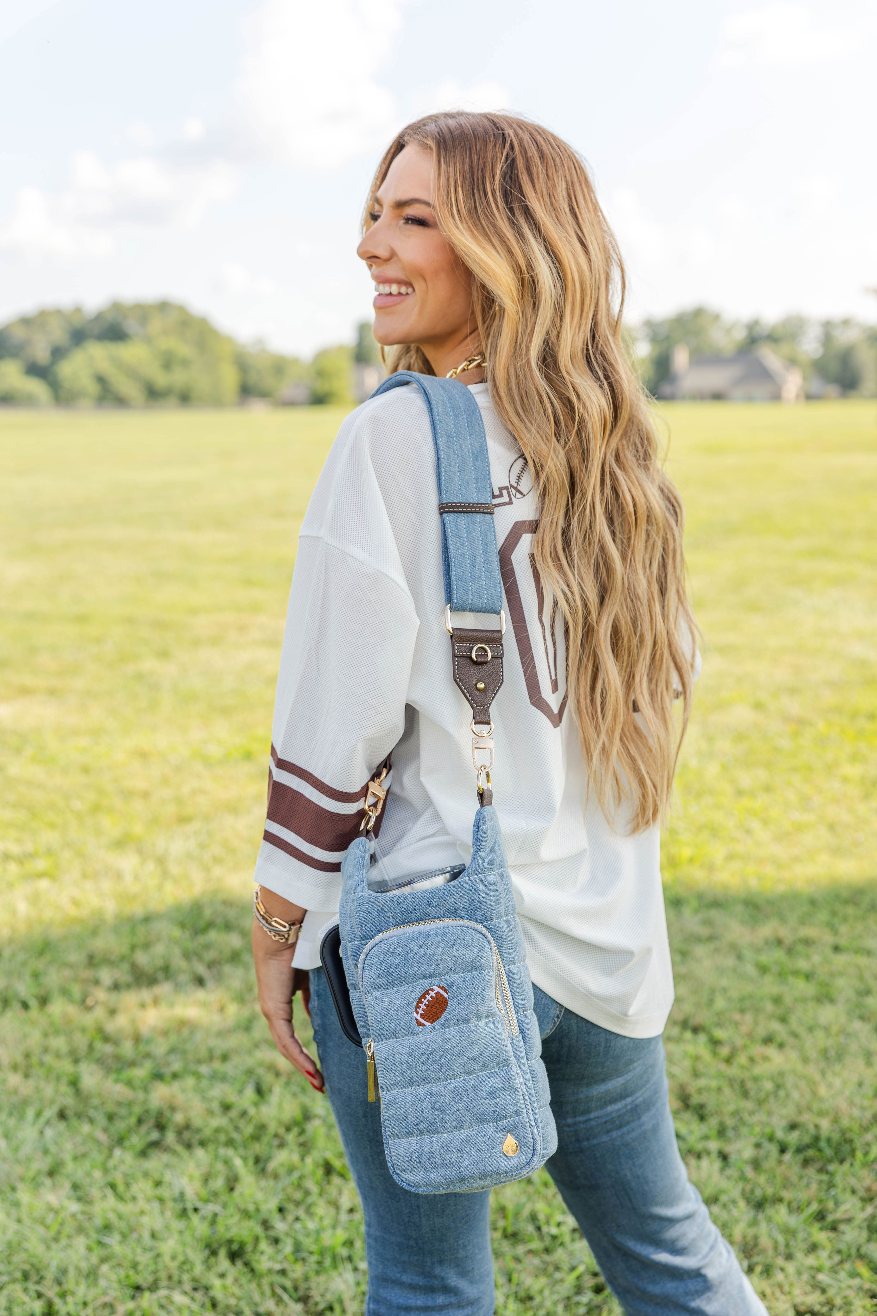 - Denim fabric: Medium wash with Vegan Leather Strap, Embroidered